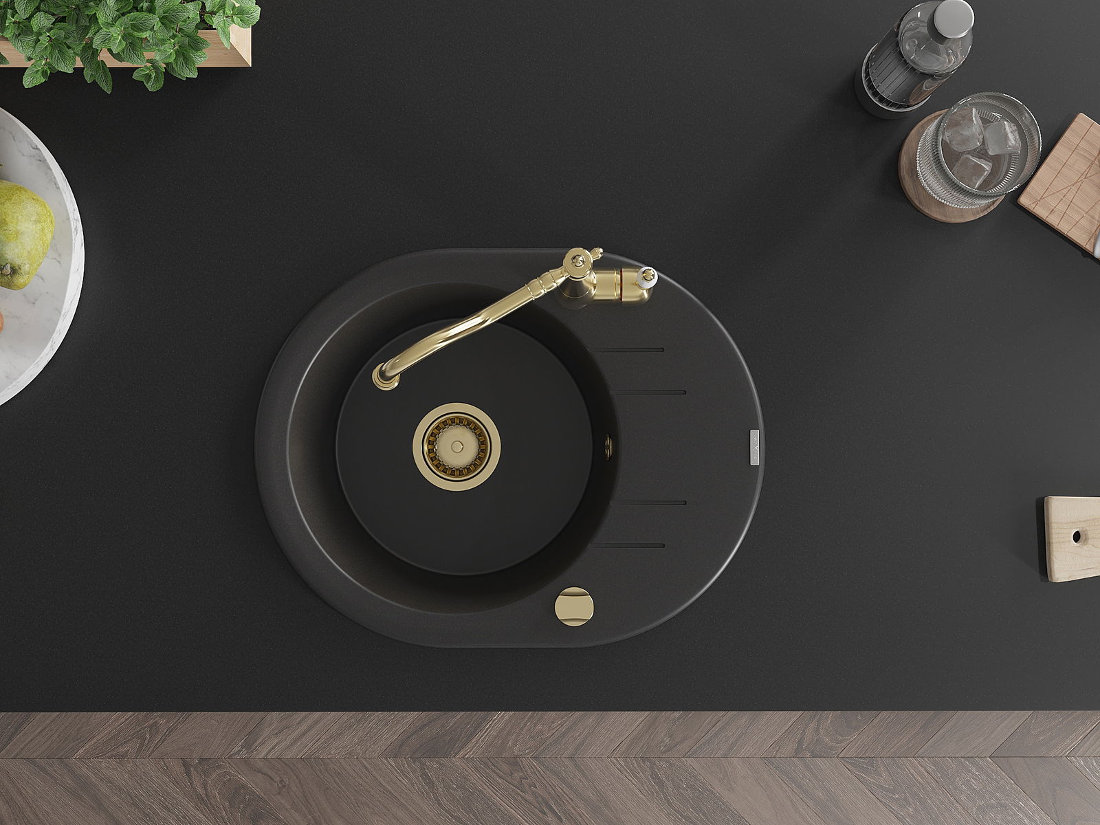 Mexen Kevin granitový dřez jednokomorový s odkapávačem a kuchyňskou baterií Carla, černý - 6517-77-670700-50