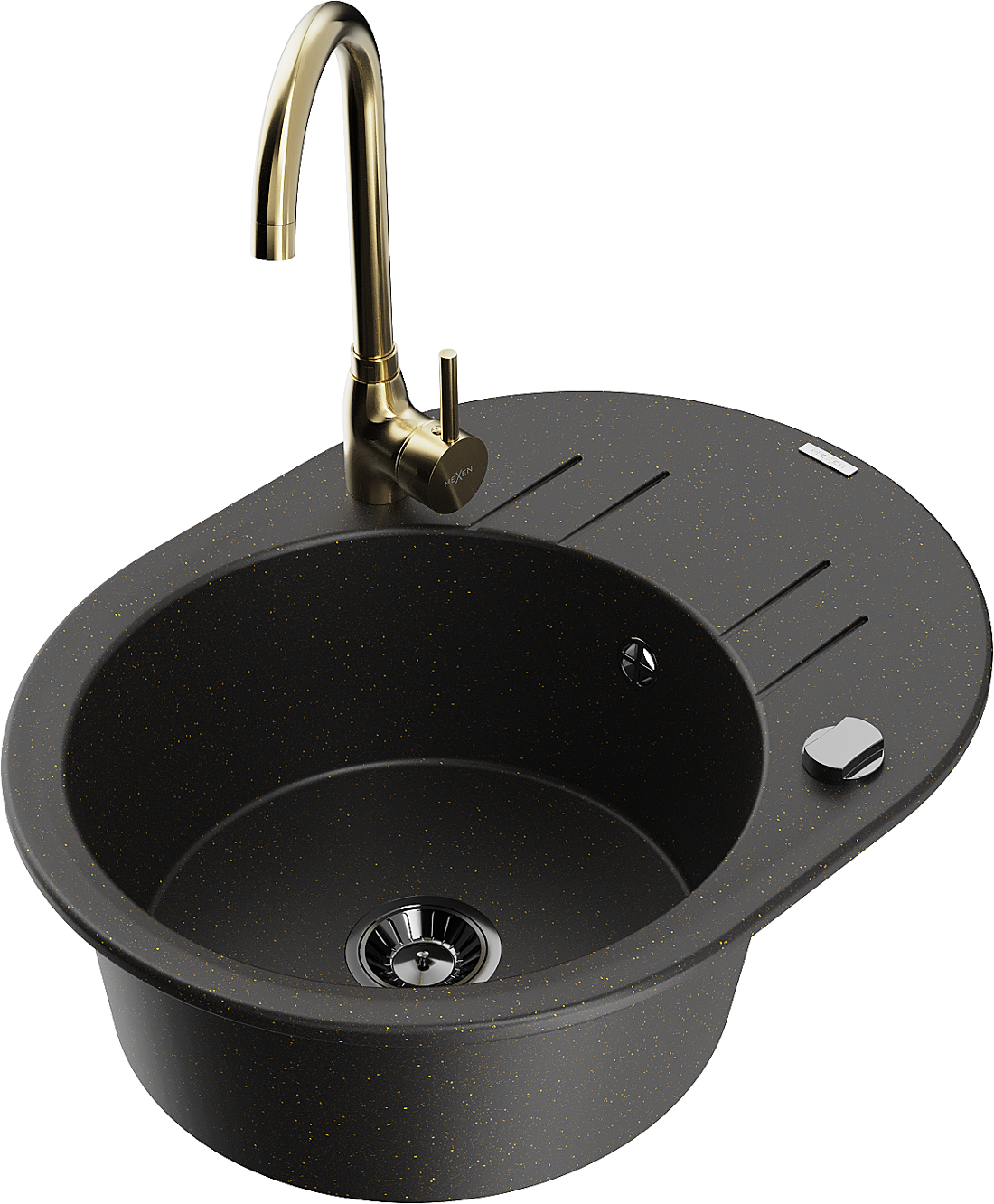 Mexen Kevin granitový dřez 1-komorový s odkapávačem a kuchyňskou baterií Telma, černý/zlatý metalik - 6517-75-670200-50-B