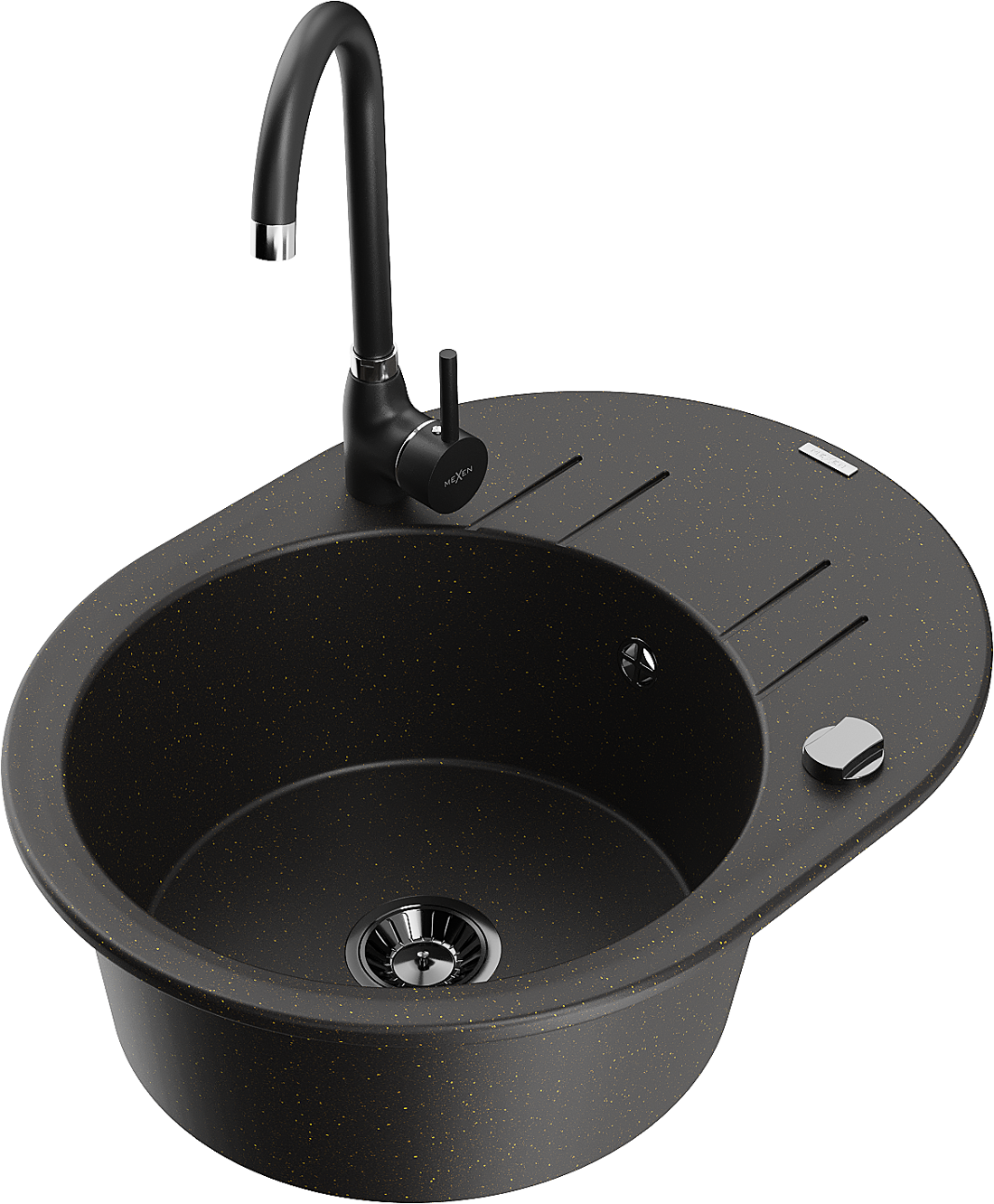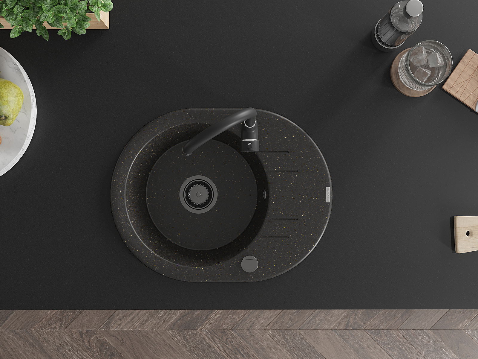 Mexen Kevin granitový dřez 1-komorový s odkapávačem a kuchyňskou baterií Telma, černý/zlatý metalik - 6517-75-670200-70-B