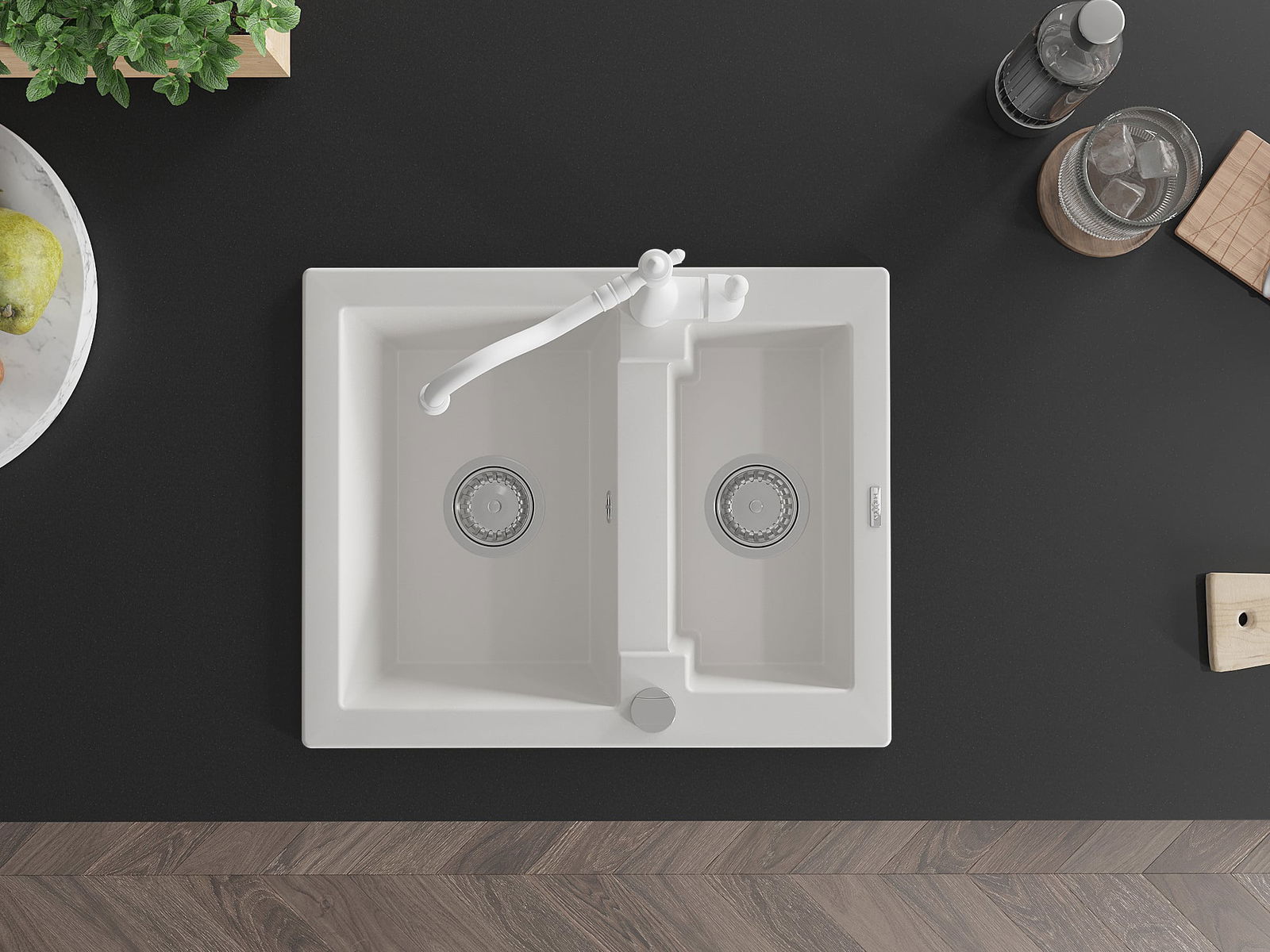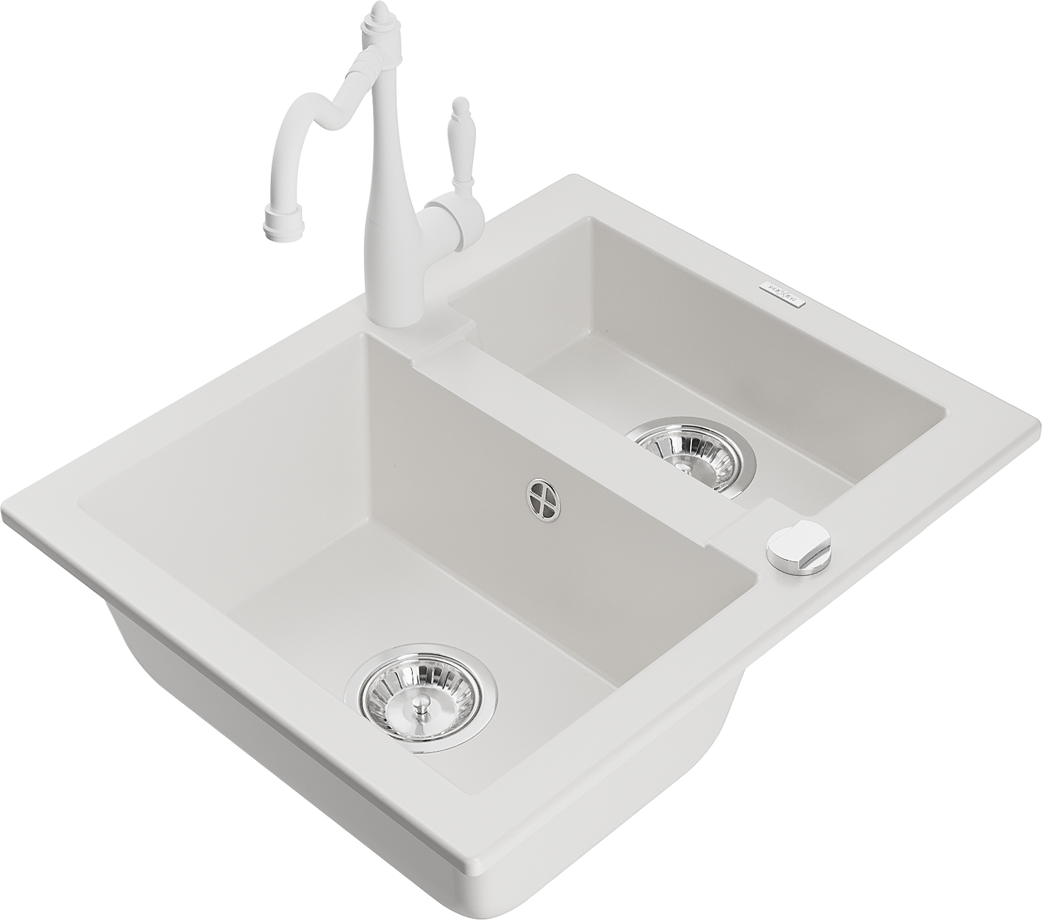Mexen Carlos granitový dřez 1,5-komorový s kuchyňskou baterií Carla, bílý - 6518-20-670700-20