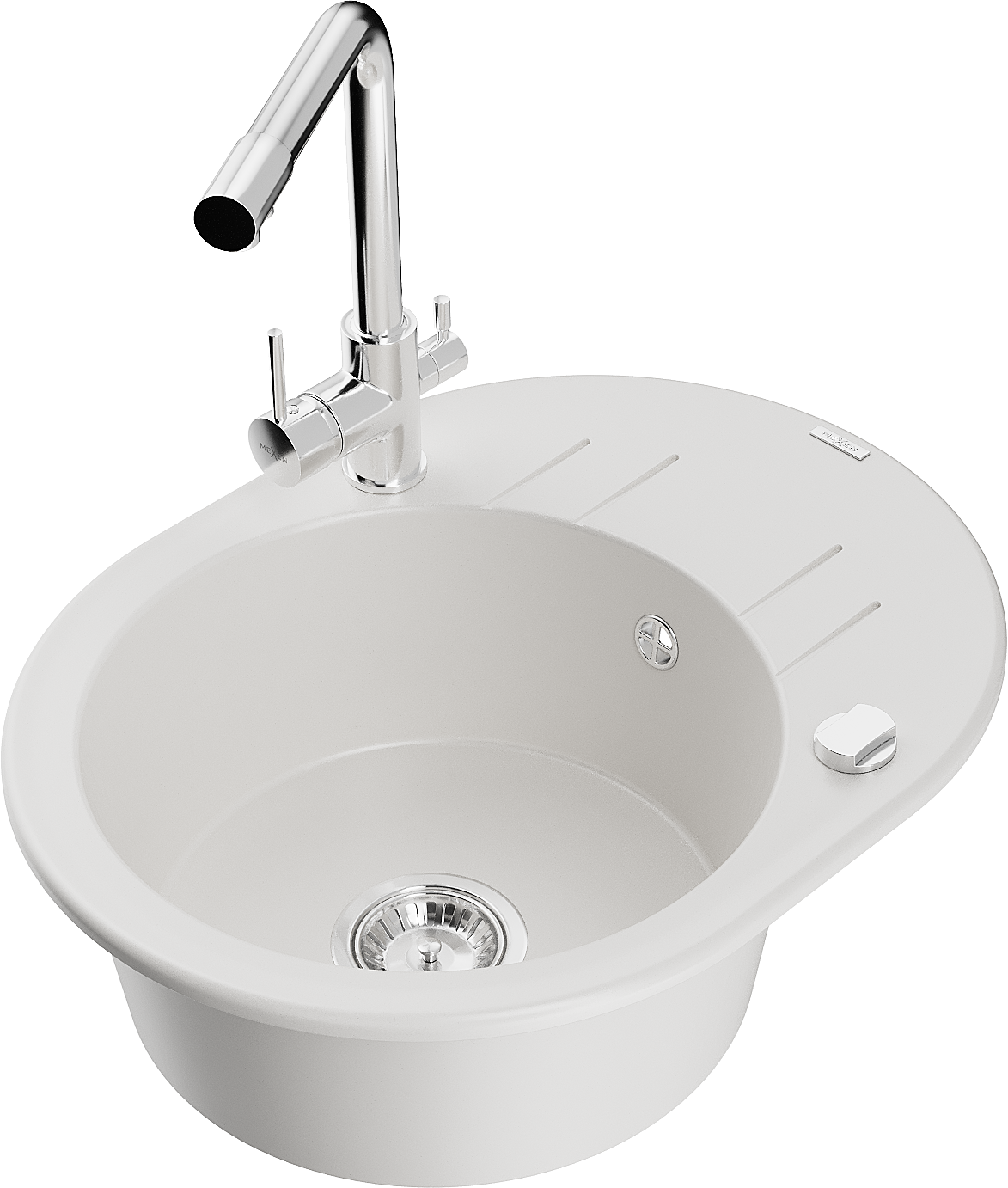 Mexen Kevin granitový dřez 1-komorový s odkapávačem a kuchyňskou baterií Duero, bílý - 6517-20-671600-00