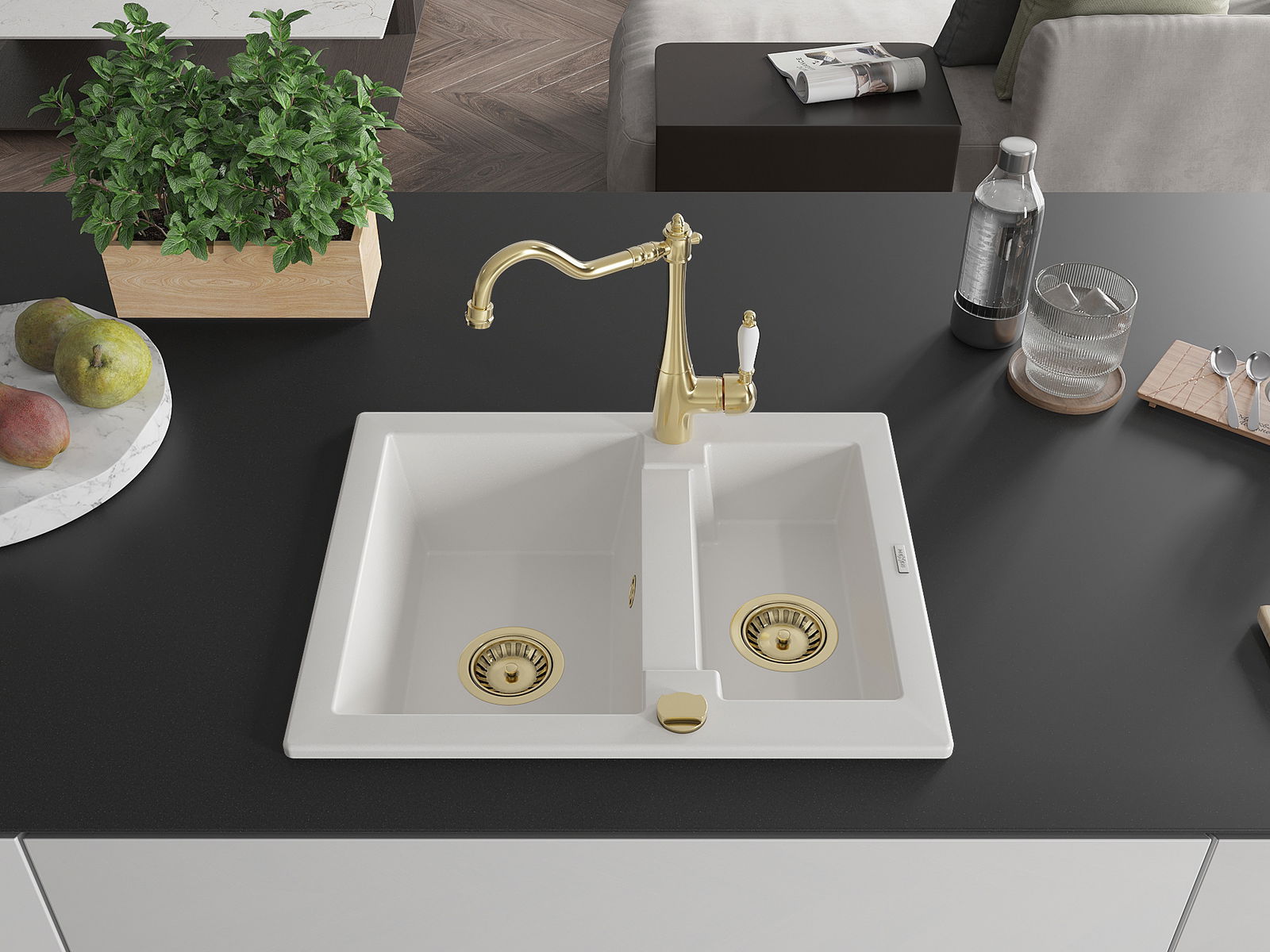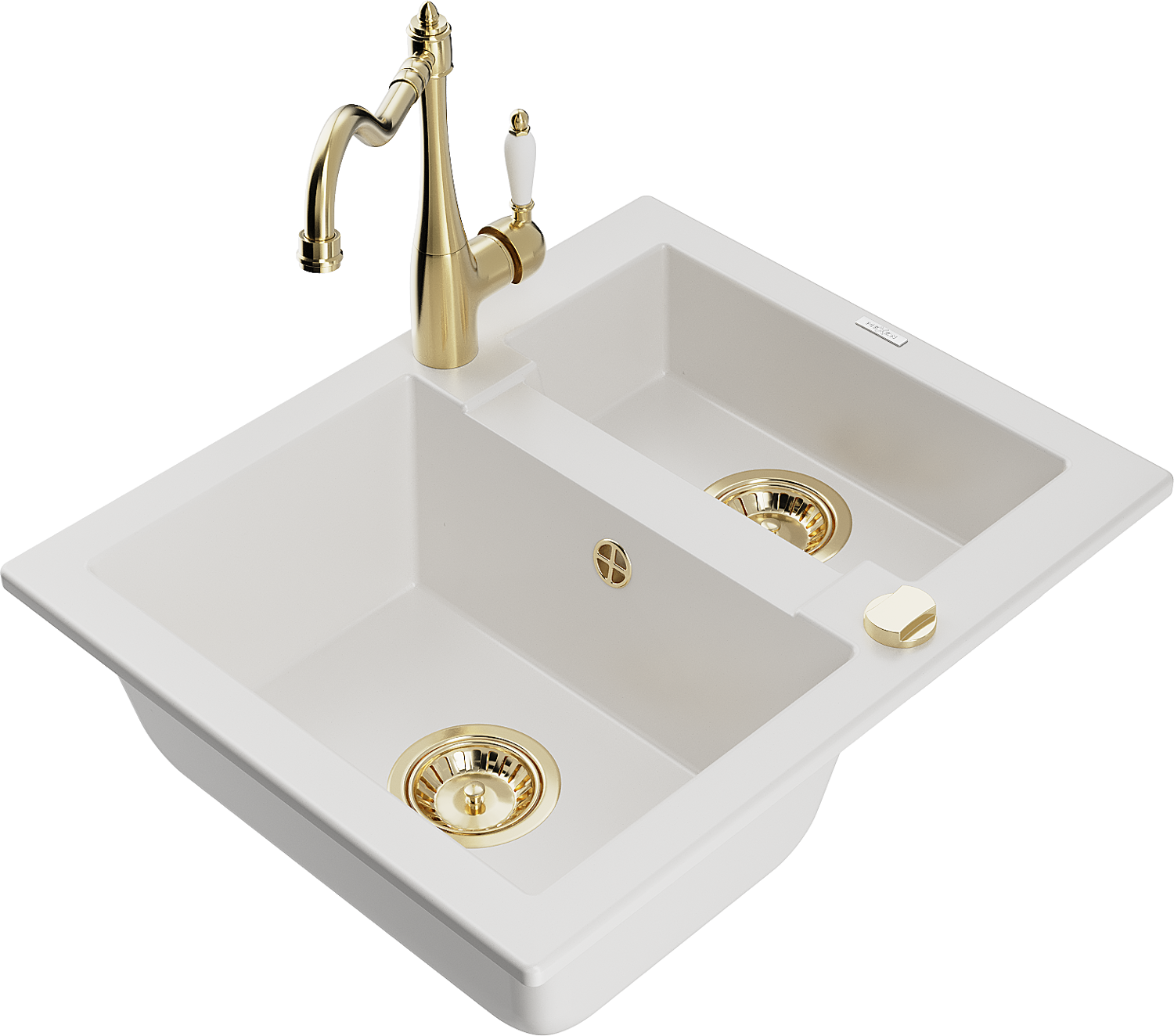 Mexen Carlos granitový dřez 1,5-komorový s kuchyňskou baterií Carla, bílý - 6518-20-670700-50