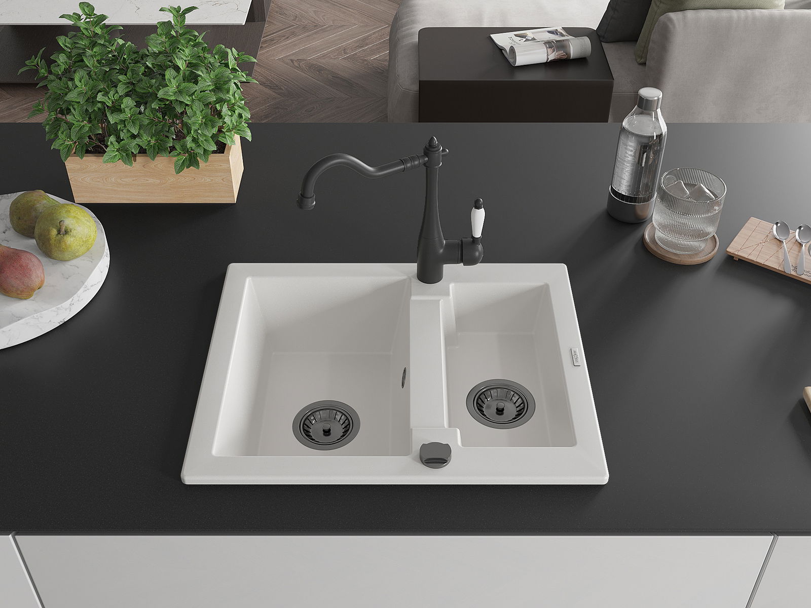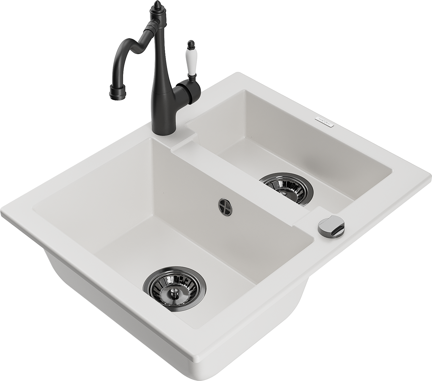 Mexen Carlos žulový dřez 1,5 komorový s kuchyňskou baterií Carla, bílý - 6518-20-670700-70