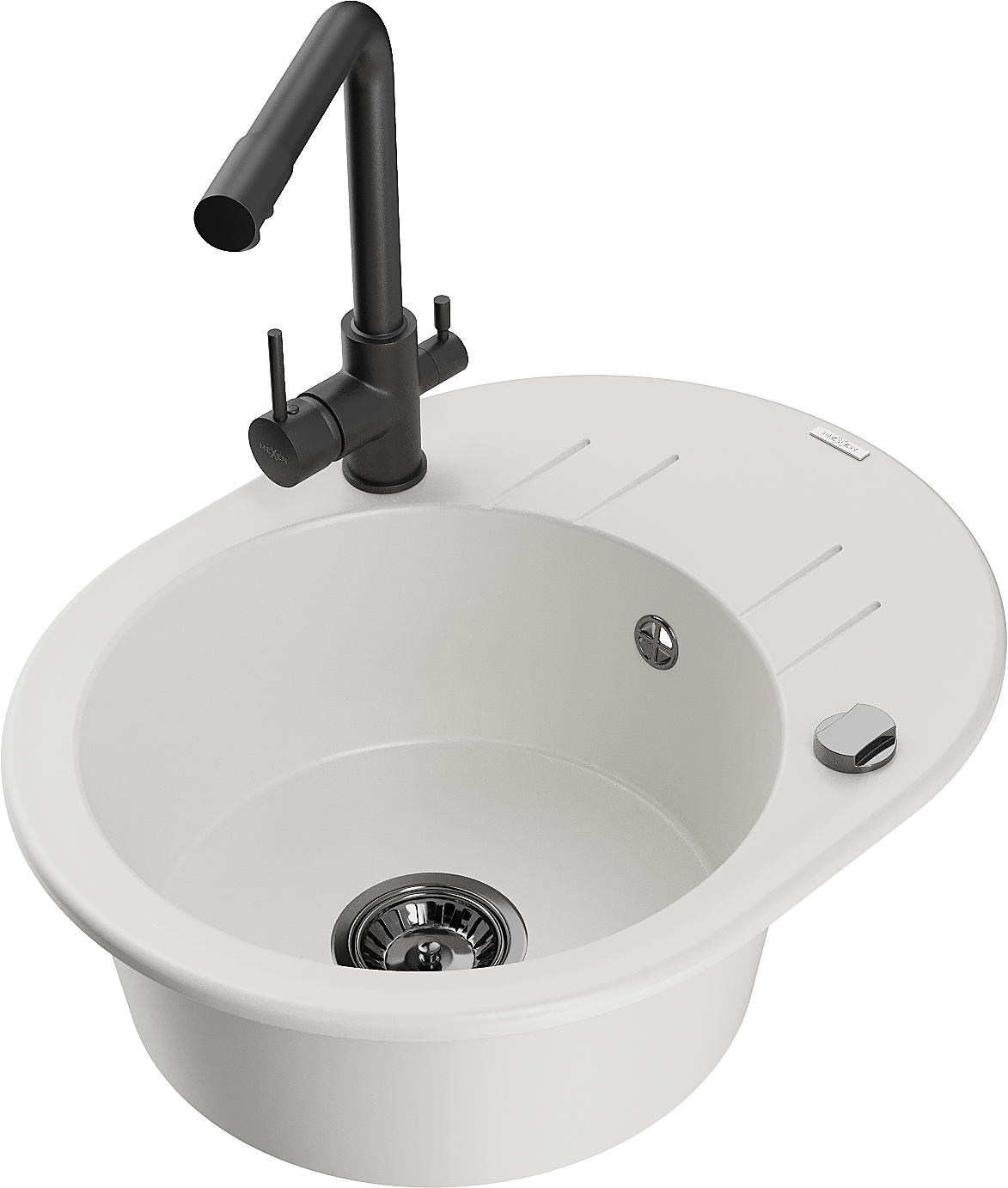 Mexen Kevin granitový dřez 1-komorový s odkapávačem a kuchyňskou baterií Duero, bílý - 6517-20-671600-70