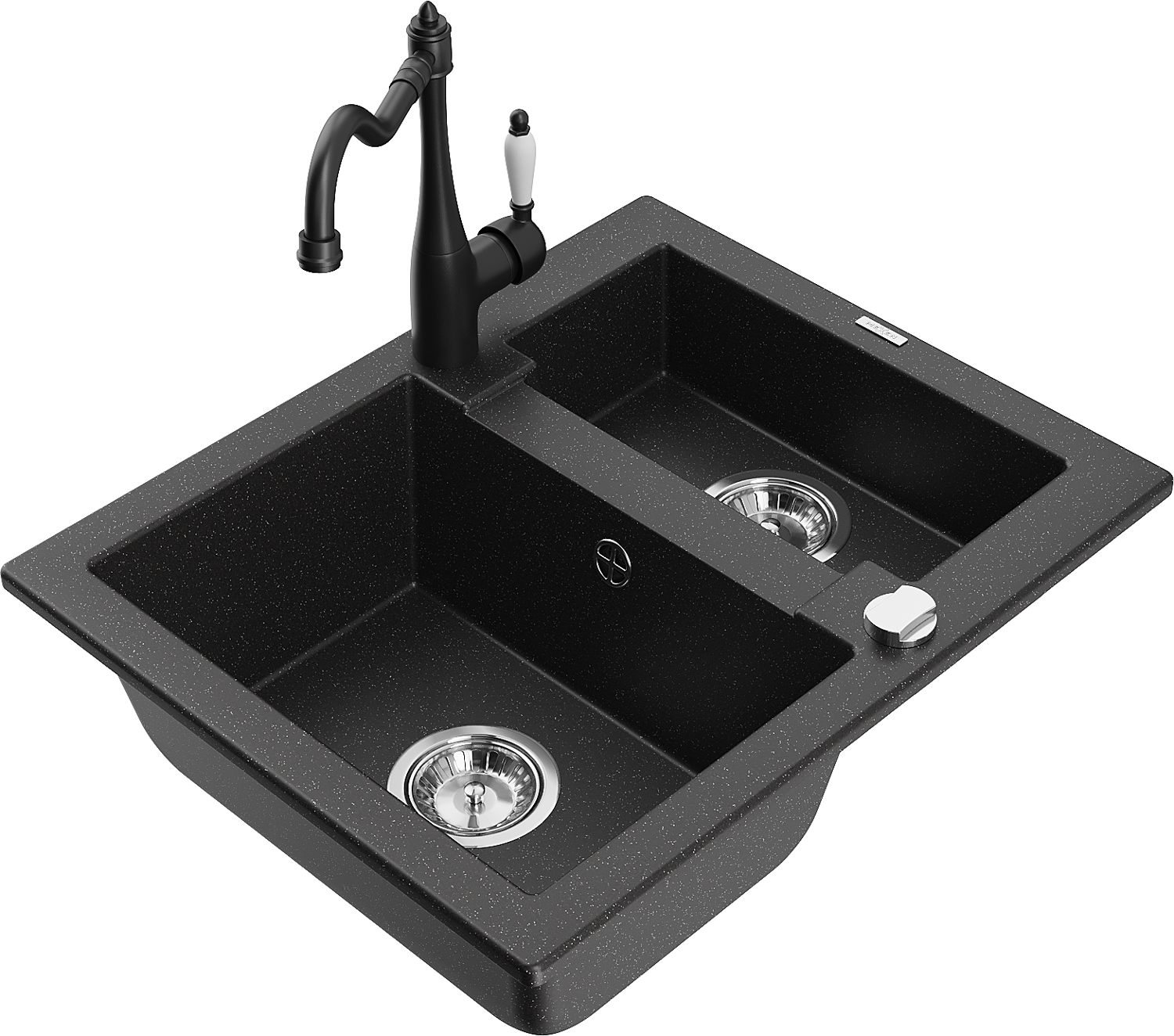 Mexen Carlos granitový dřez 1,5-komorový s kuchyňskou baterií Carla, černý/stříbrný metalík - 6518-73-670700-70