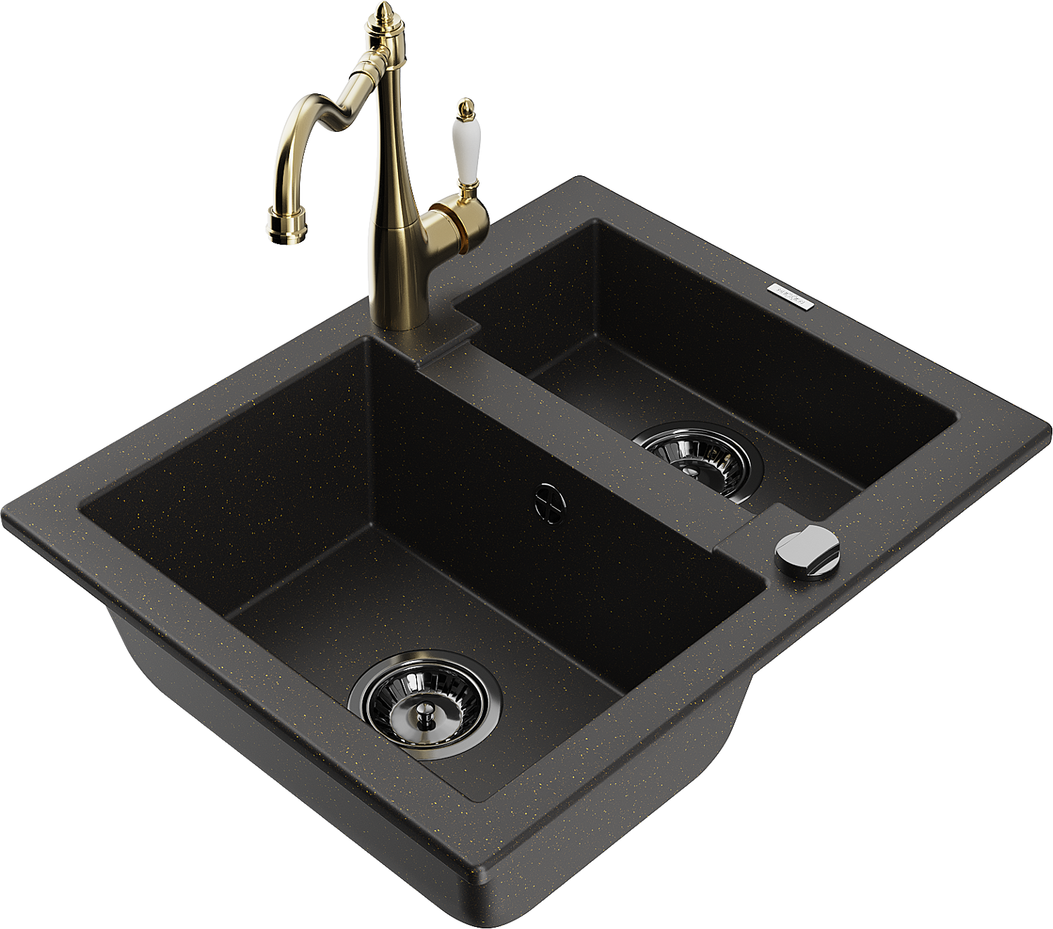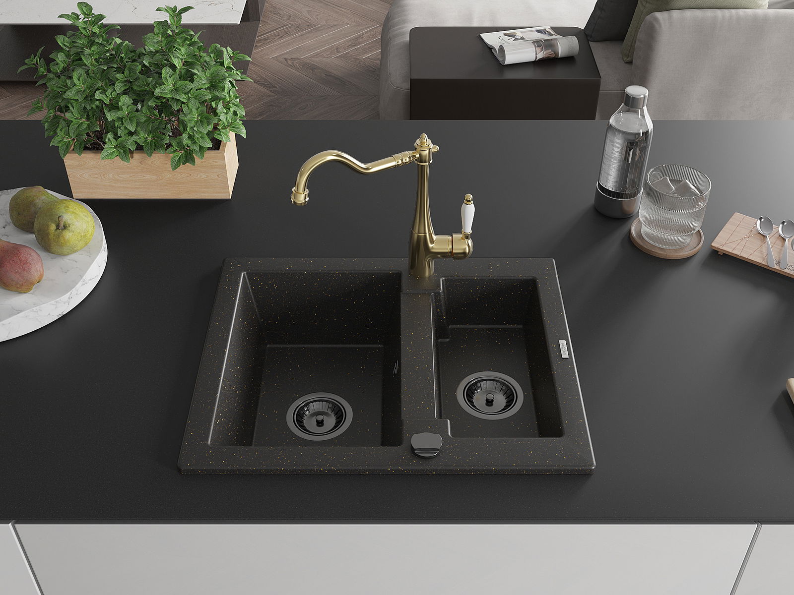 Mexen Carlos granitový dřez 1,5-komorový s kuchyňskou baterií Carla, černý/zlatý metalik - 6518-75-670700-50-B