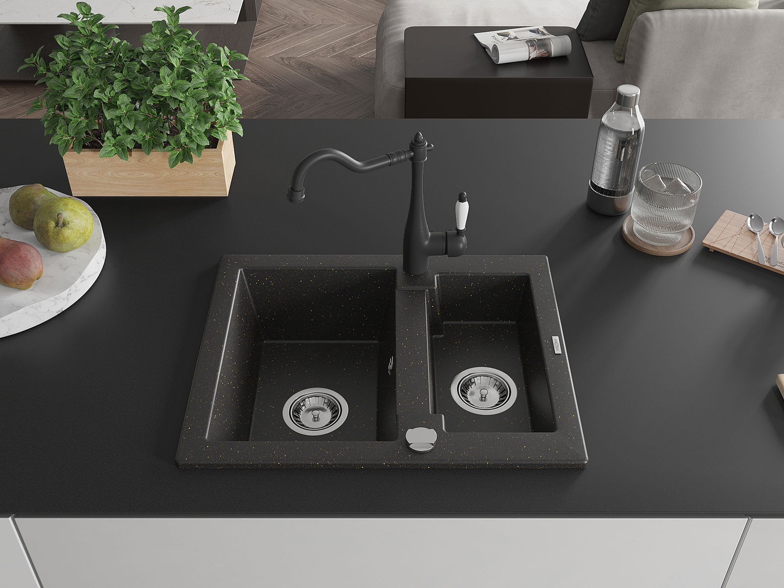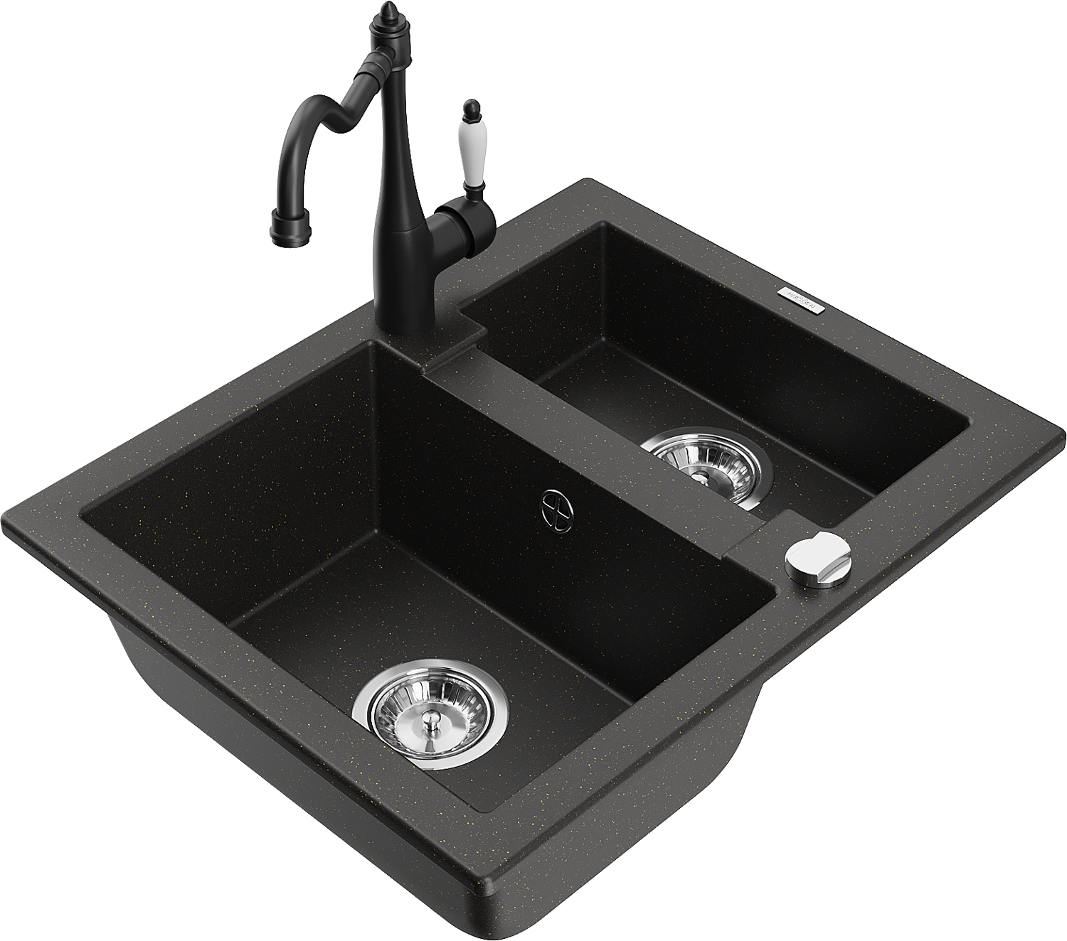 Mexen Carlos granitový dřez 1,5-komorový s kuchyňskou baterií Carla, černý/zlatý metalik - 6518-75-670700-70