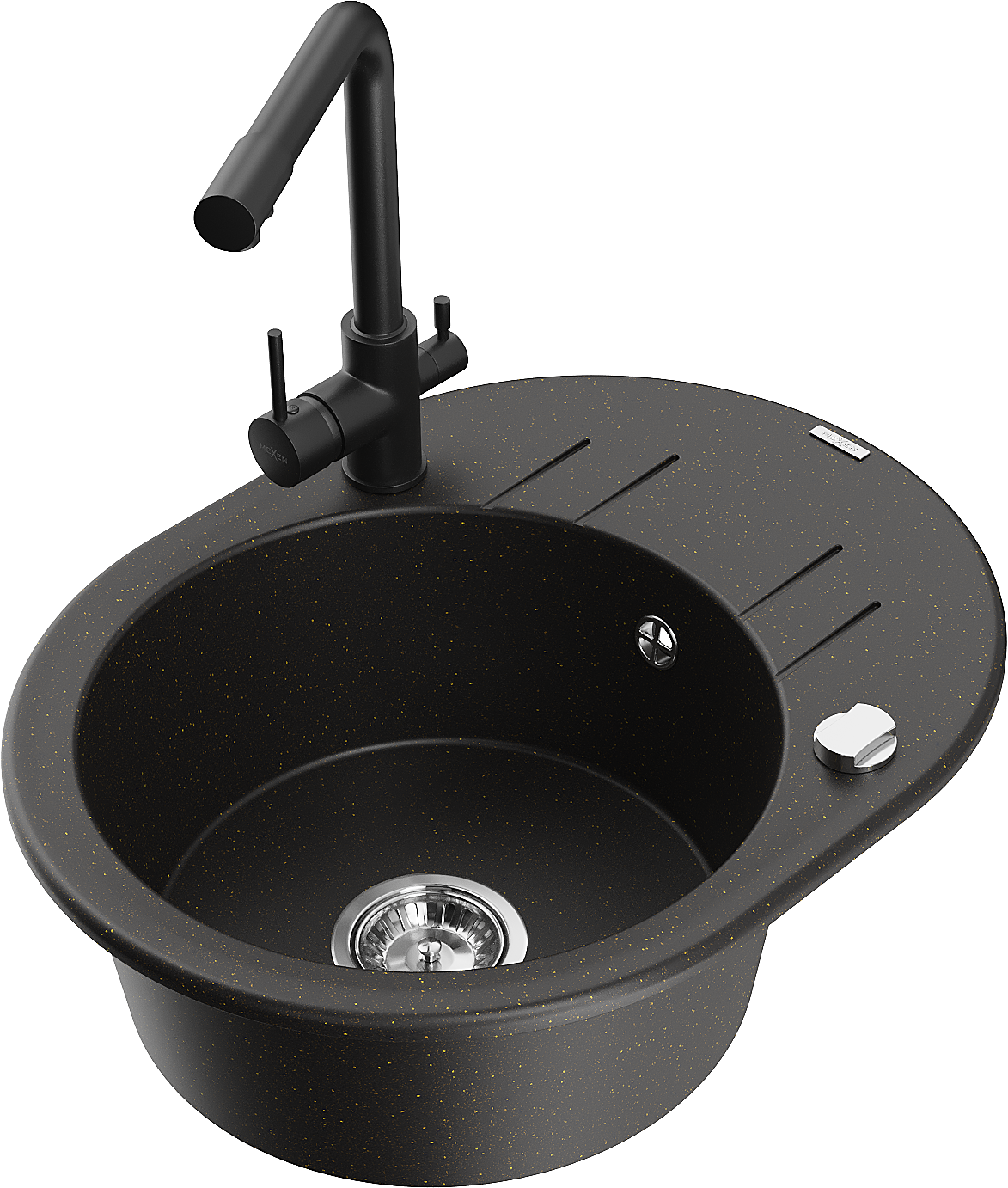 Mexen Kevin jednokomorový granitový dřez s odkapávačem a kuchyňskou baterií Duero, černý/zlatý metalik - 6517-75-671600-70