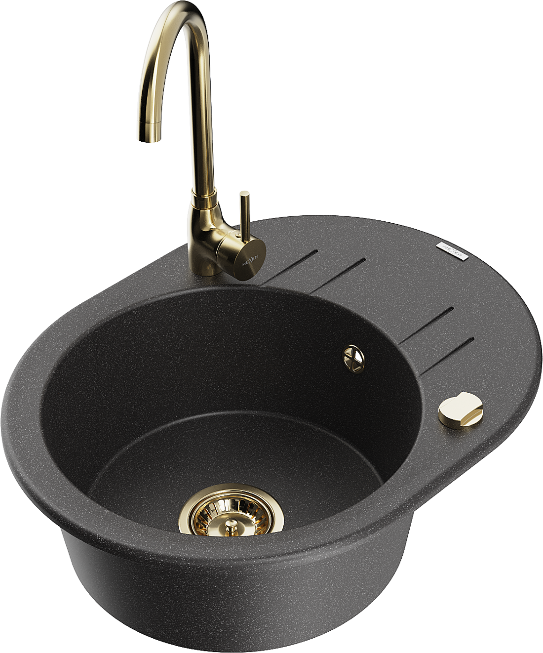 Mexen Kevin granitový dřez 1-komorový s odkapávačem a kuchyňskou baterií Telma, černý s tečkami - 6517-76-670200-50