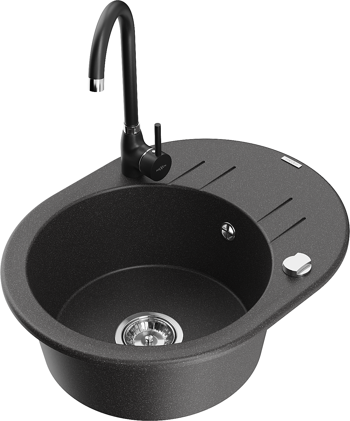 Mexen Kevin granitový dřez 1-komorový s odkapávačem a kuchyňskou baterií Telma, černý skvrnitý - 6517-76-670200-70