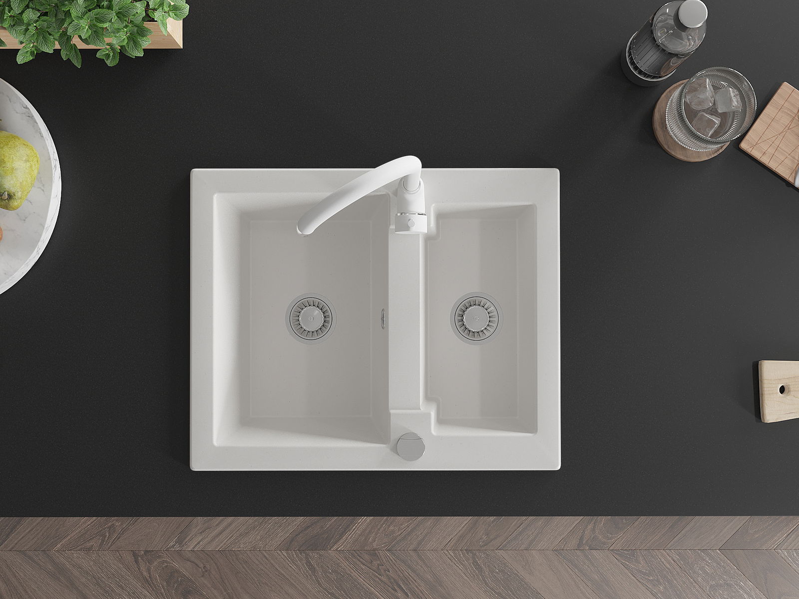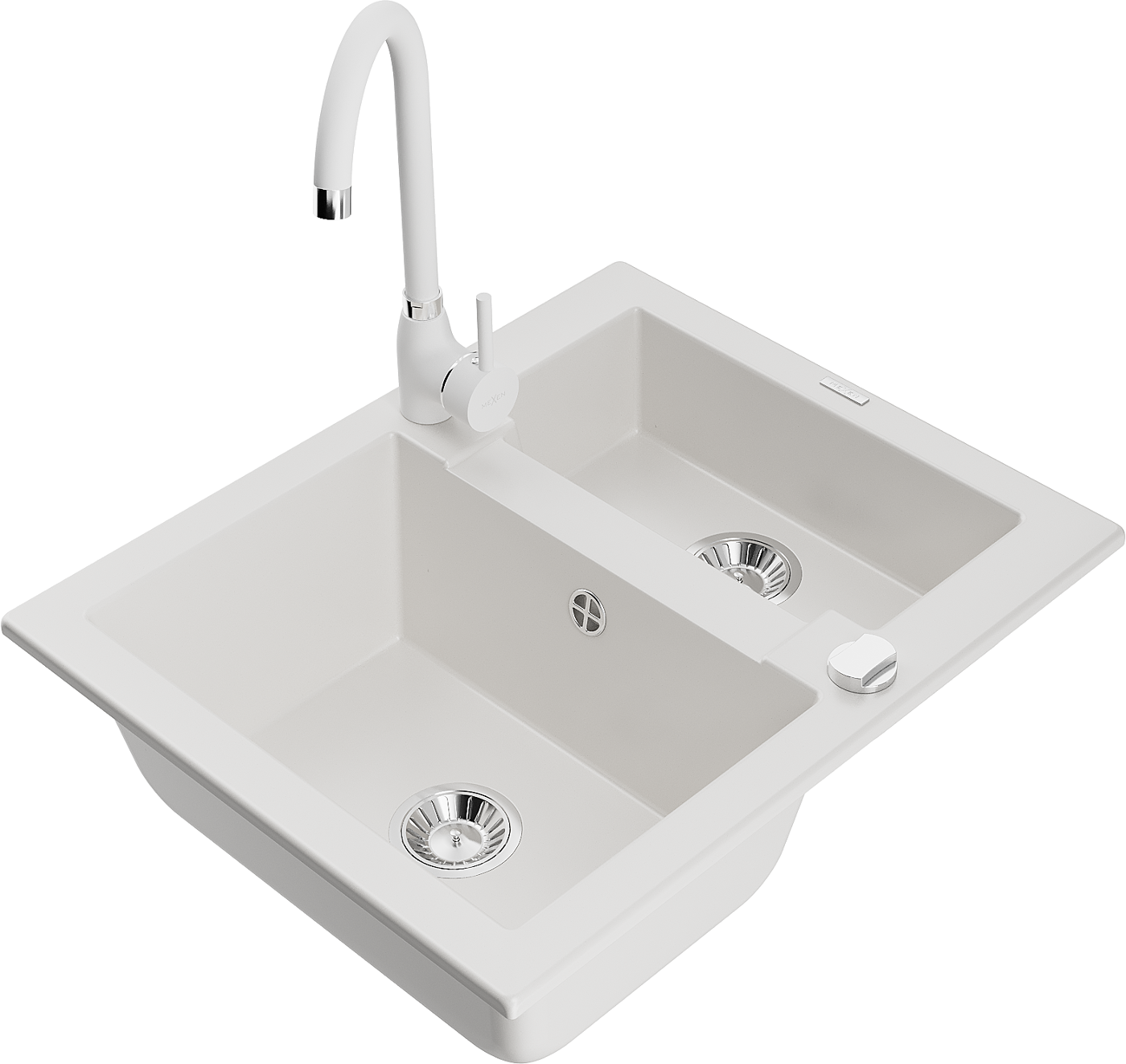 Mexen Carlos granitový dřez 1,5-komorový s kuchyňskou baterií Telma, bílý - 6518-20-670200-20