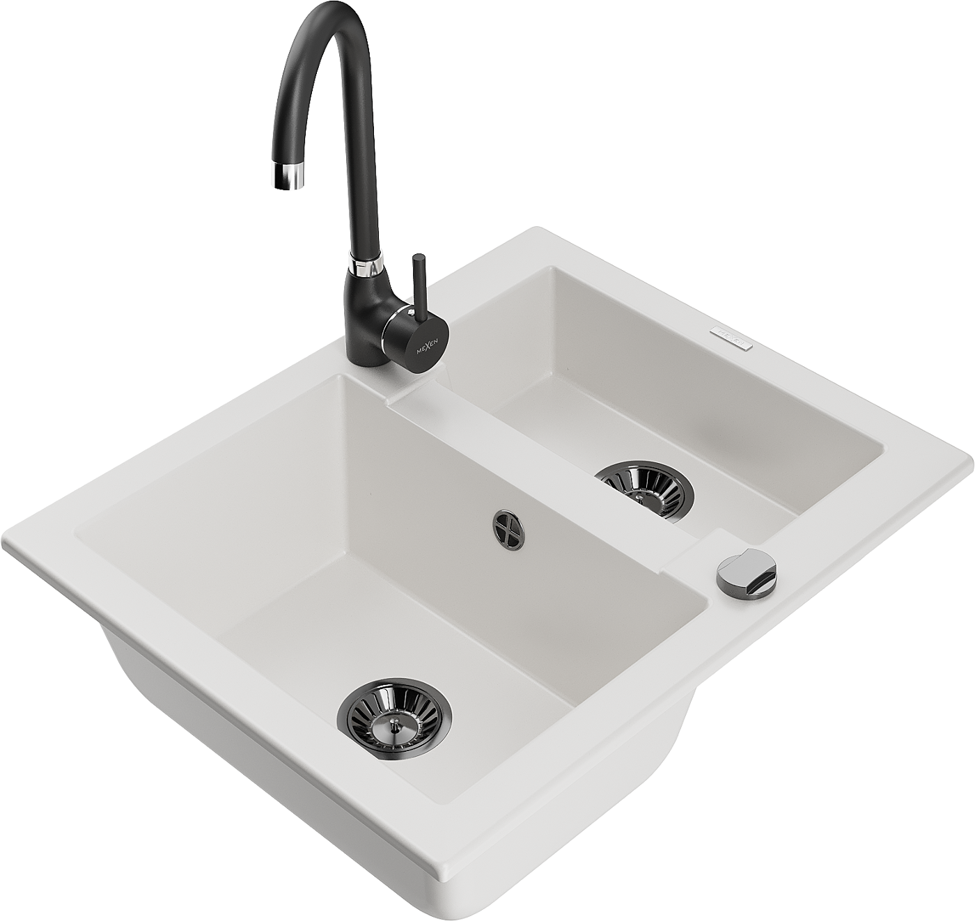 Mexen Carlos granitový dřez 1,5-komorový s kuchyňskou baterií Telma, bílá - 6518-20-670200-70