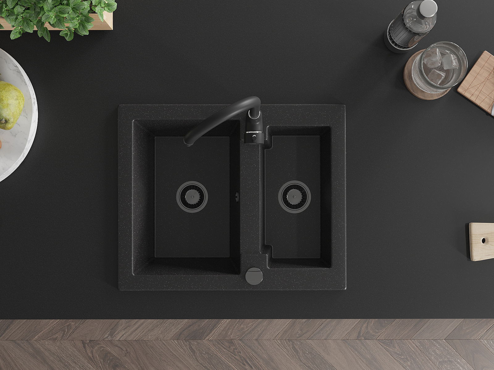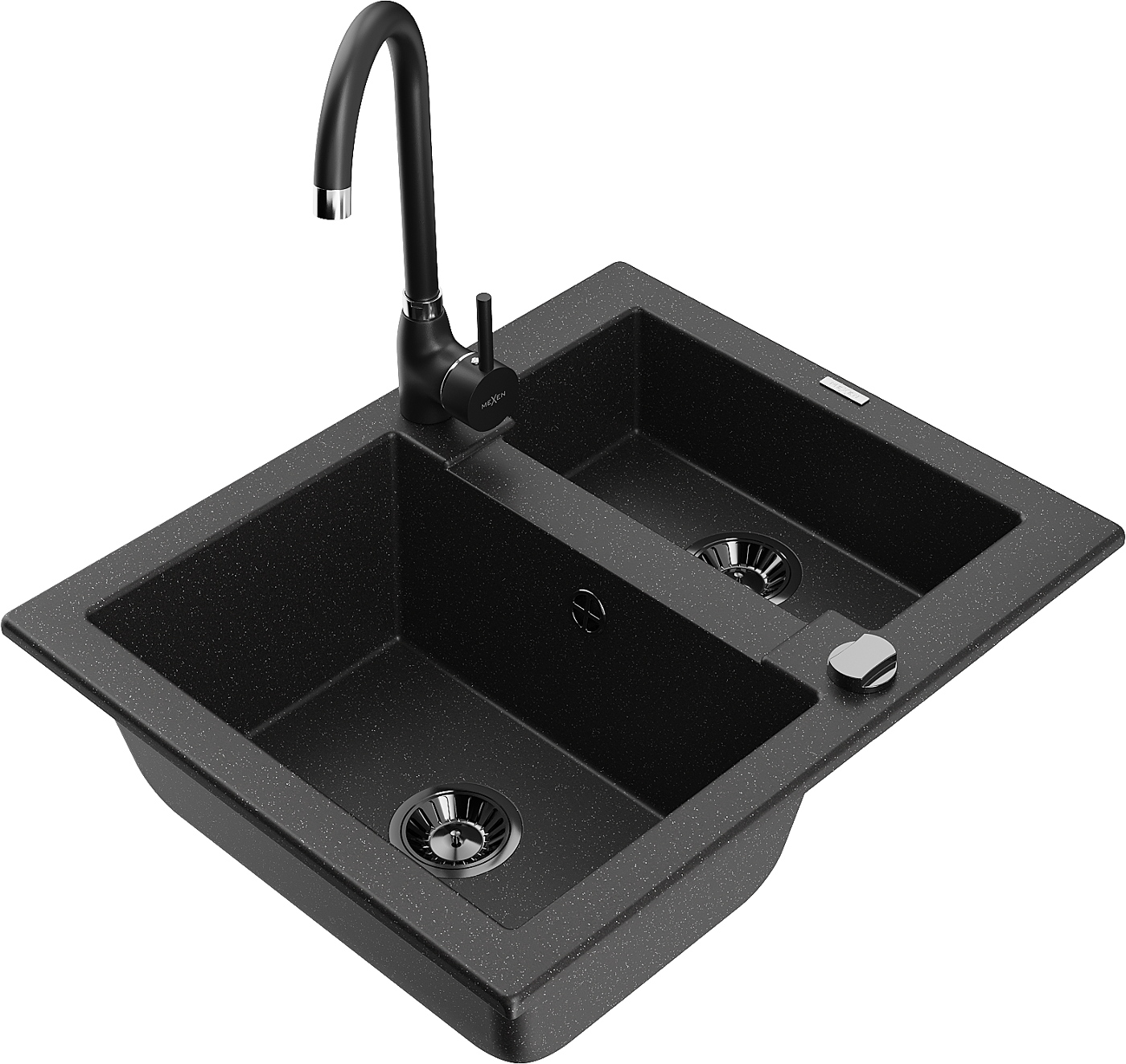 Mexen Carlos žulový dřez 1,5-komorový s kuchyňskou baterií Telma, černý/stříbrný metalik - 6518-73-670200-70-B
