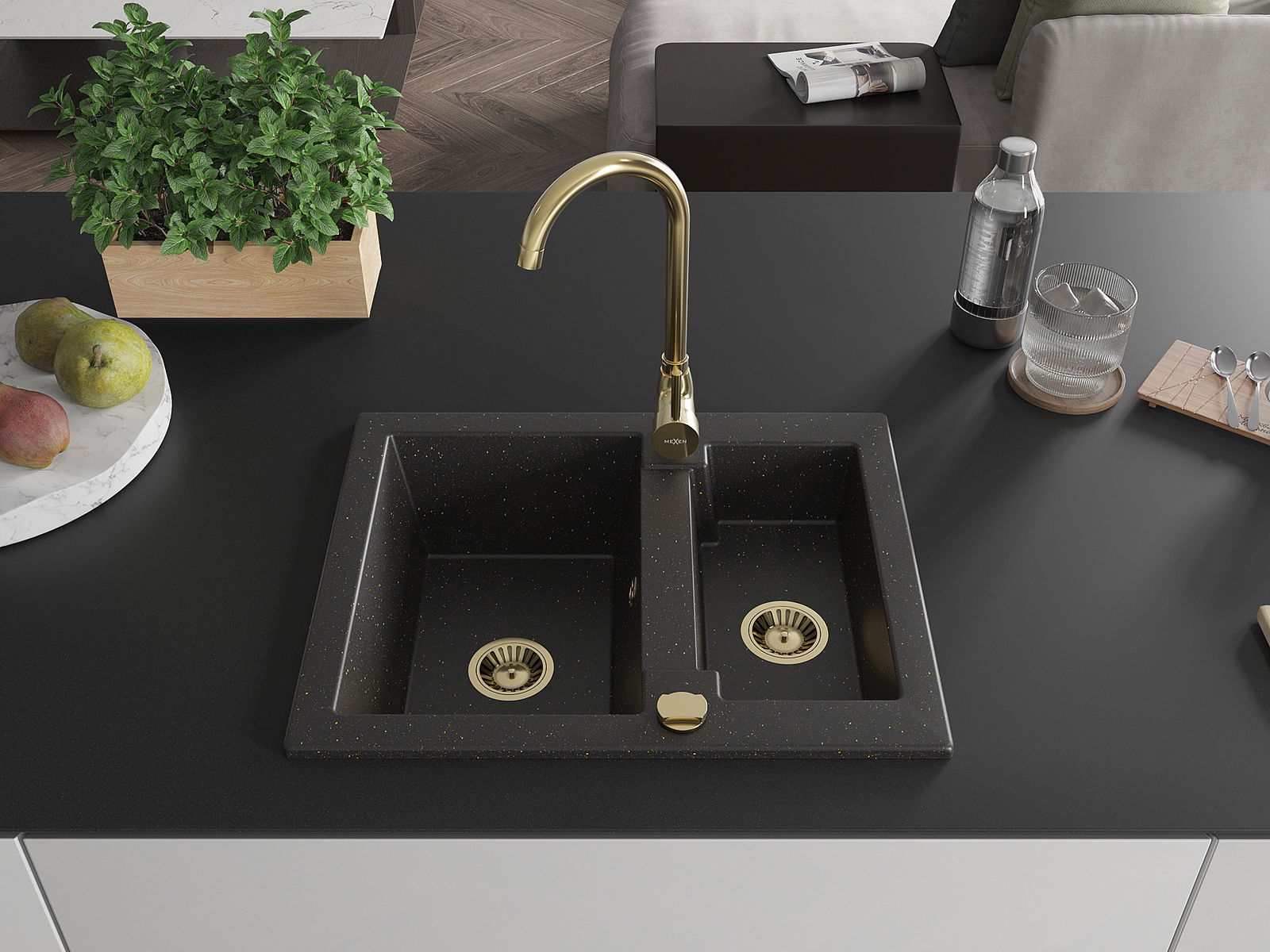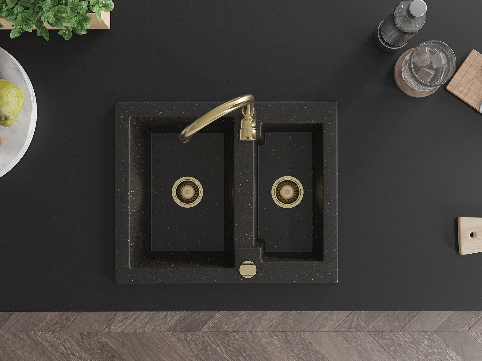 Mexen Carlos granitový dřez 1,5-komorový s kuchyňskou baterií Telma, černý/zlatý metalik - 6518-75-670200-50
