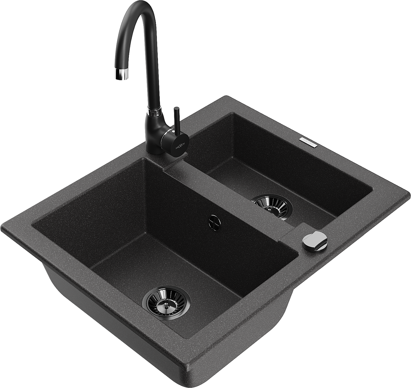 Mexen Carlos žulový dřez 1,5-komorový s kuchyňskou baterií Telma, černý skvrnitý - 6518-76-670200-70-B