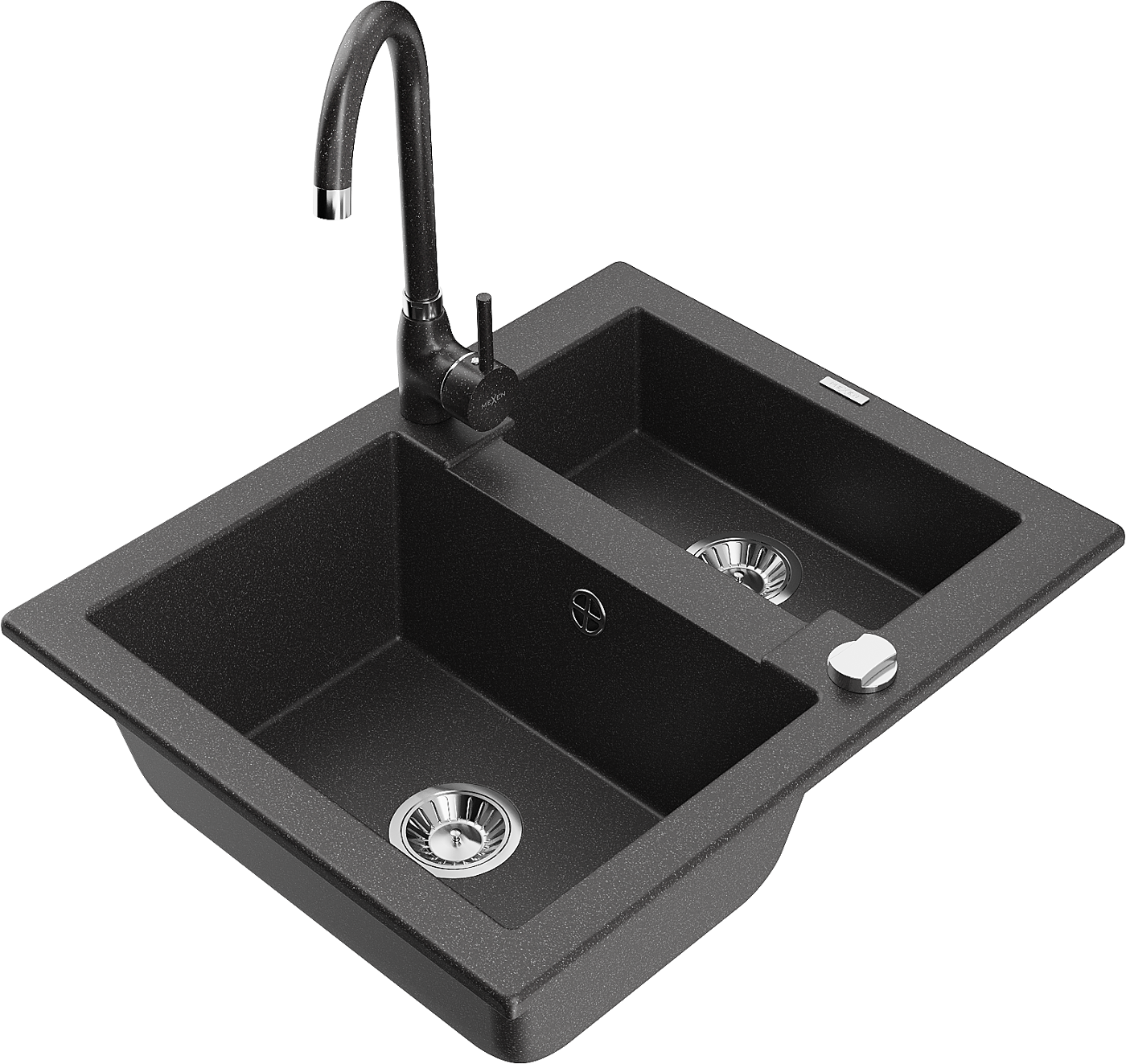 Mexen Carlos granitový dřez 1,5-komorový s kuchyňskou baterií Telma, černý sypaný - 6518-76-670200-76