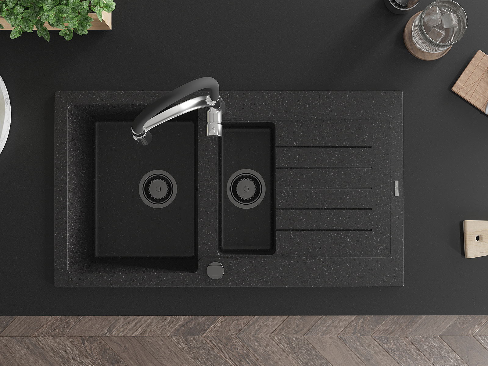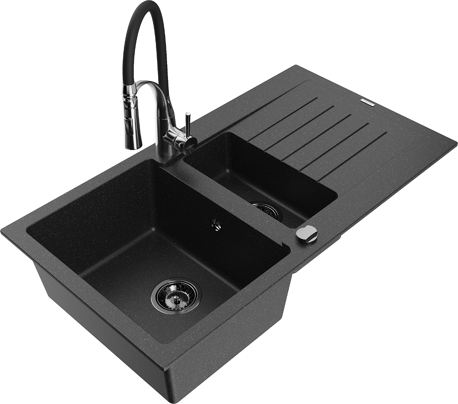 Mexen Matias žulový dřez 1,5-komorový s odkapávačem a kuchyňskou baterií Aster, černý/stříbrný - 6502-73-73450-07-B