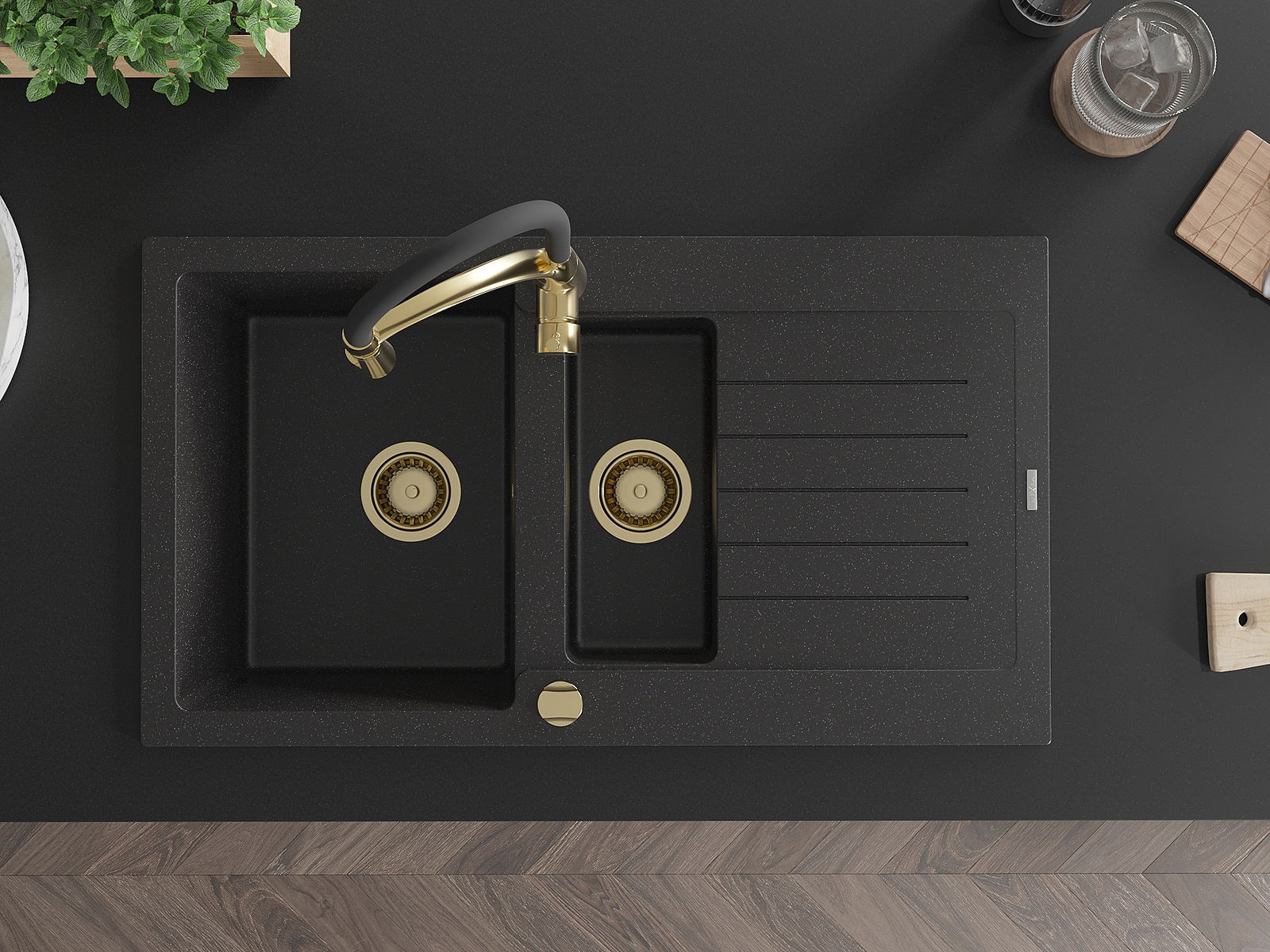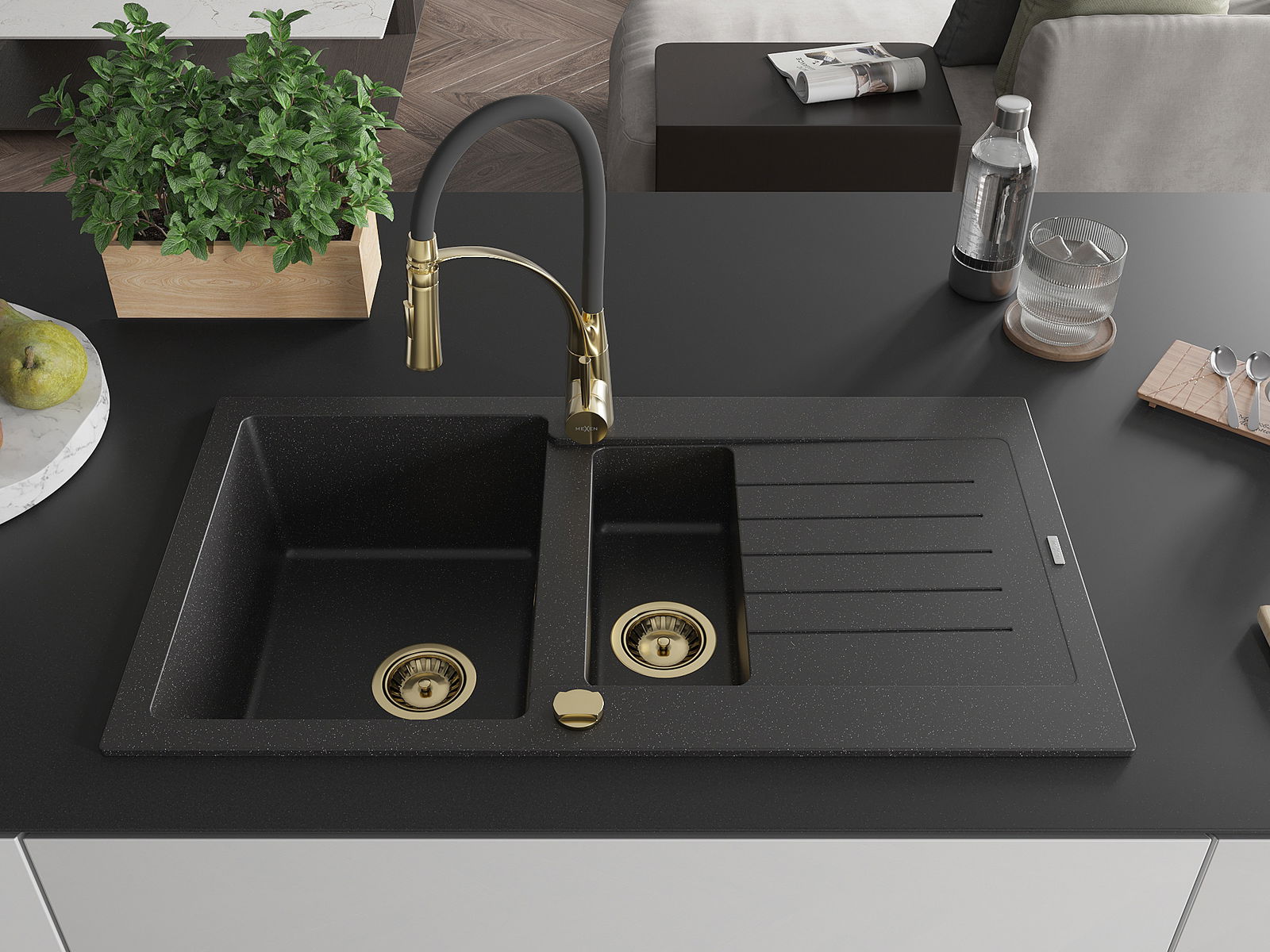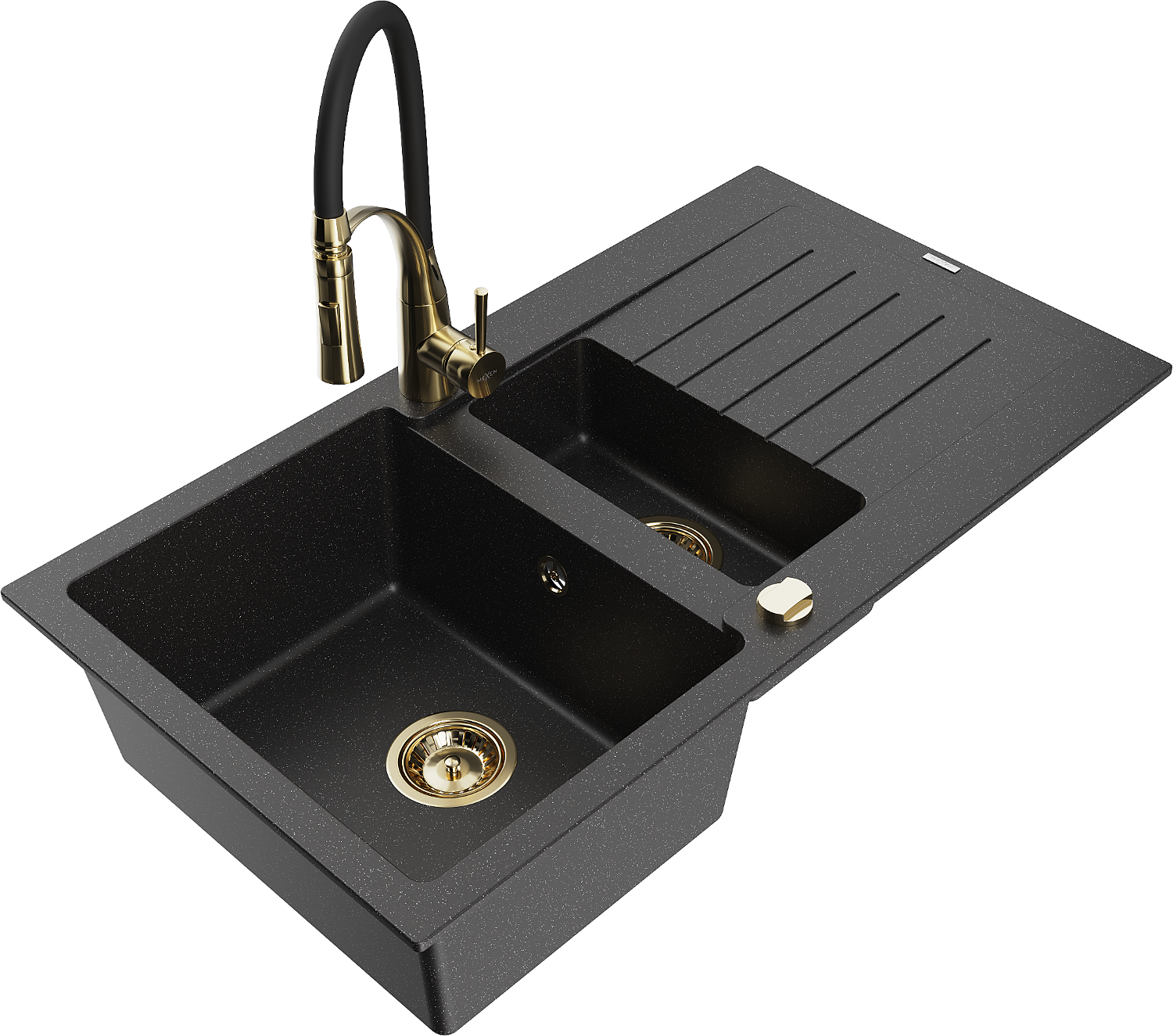 Mexen Matias granitový dřez 1,5-komorový s odkapávačem a kuchyňskou baterií Aster, černá/stříbrná - 6502-73-73450-57-G