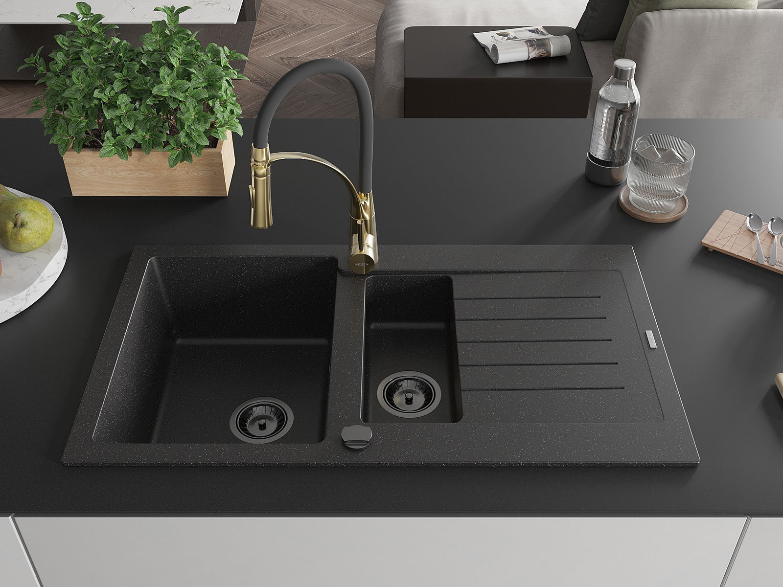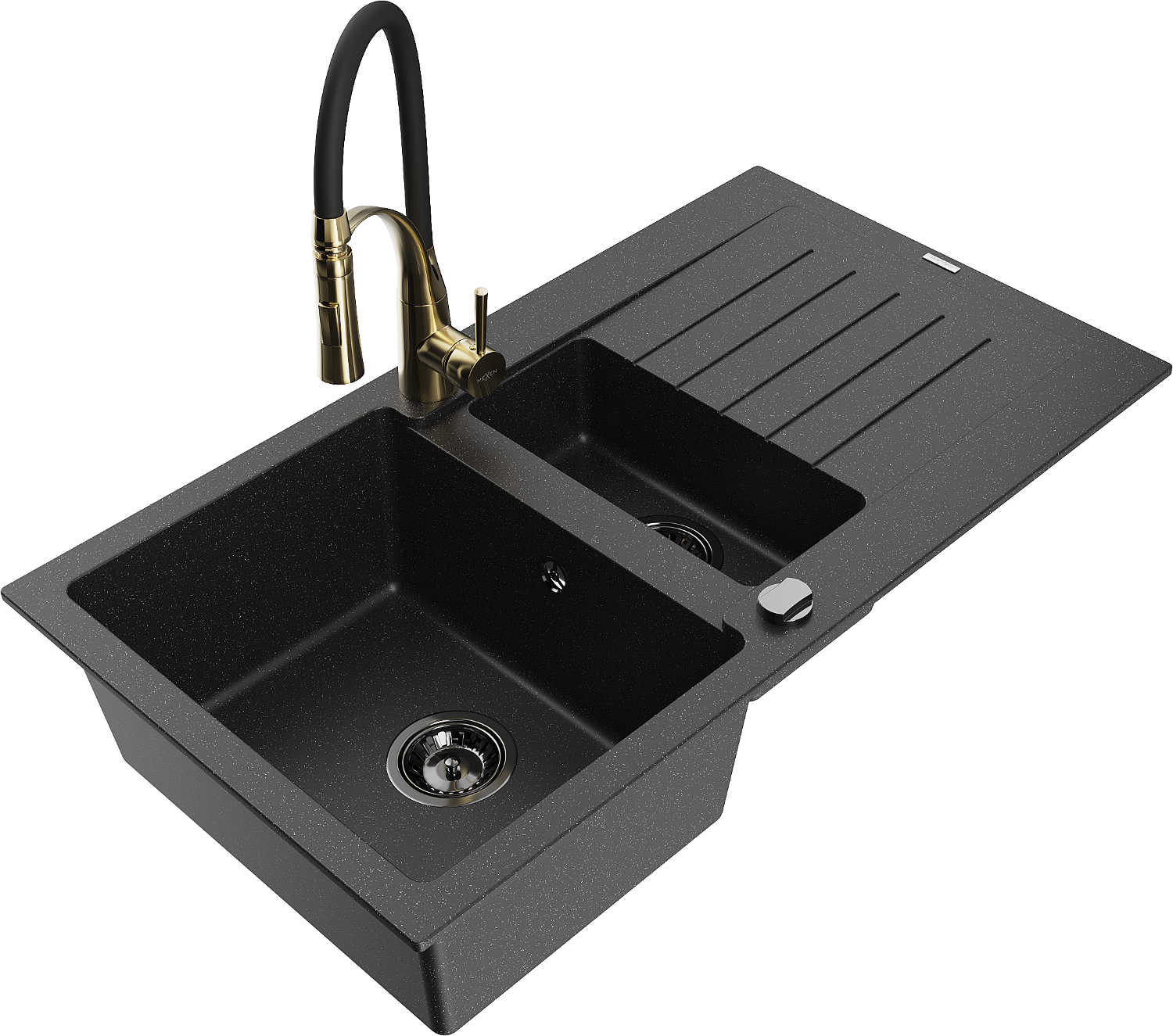Mexen Matias žulový dřez 1,5-komorový s odkapávačem a kuchyňskou baterií Aster, černý/stříbrný - 6502-73-73450-57-B