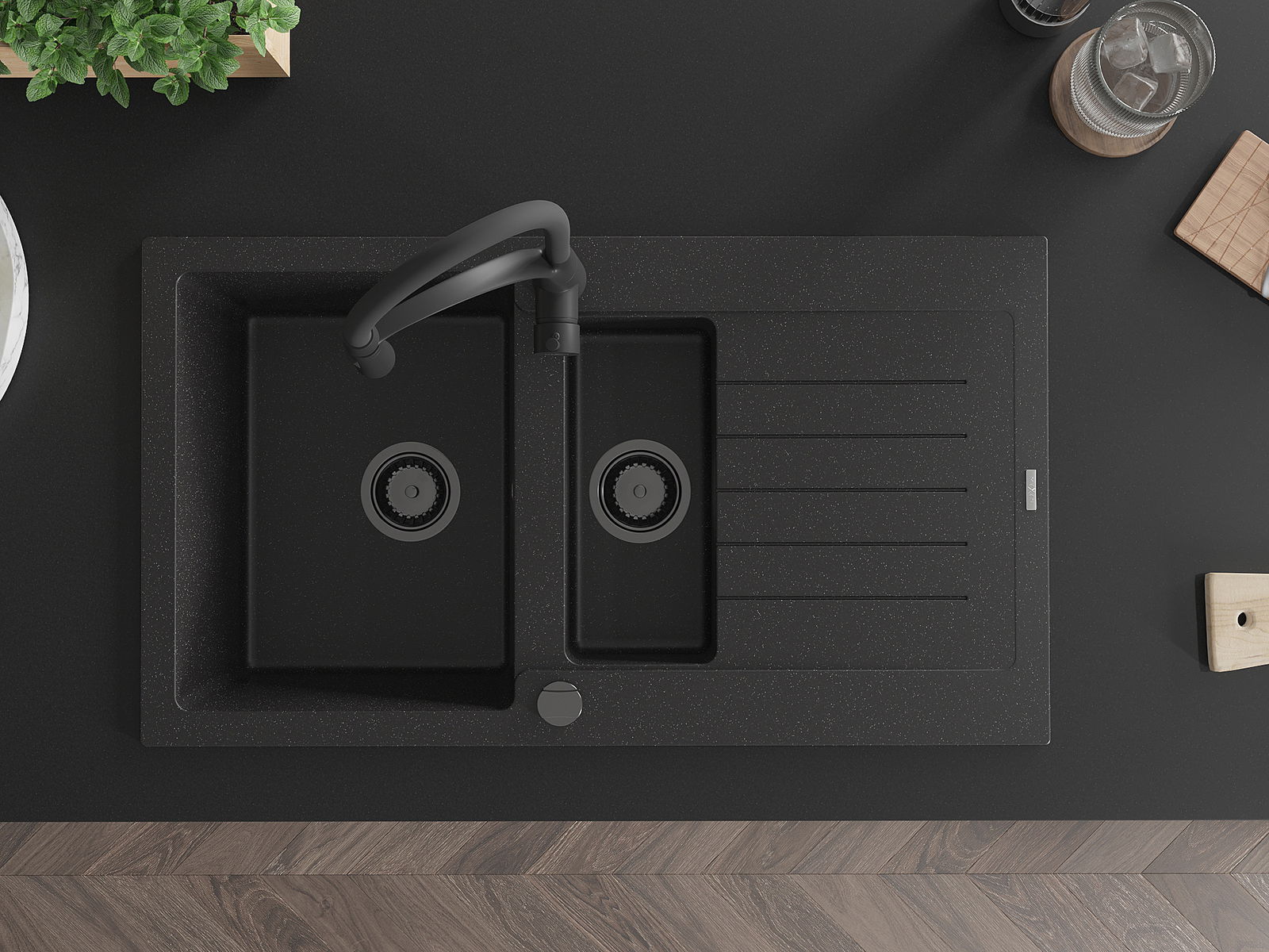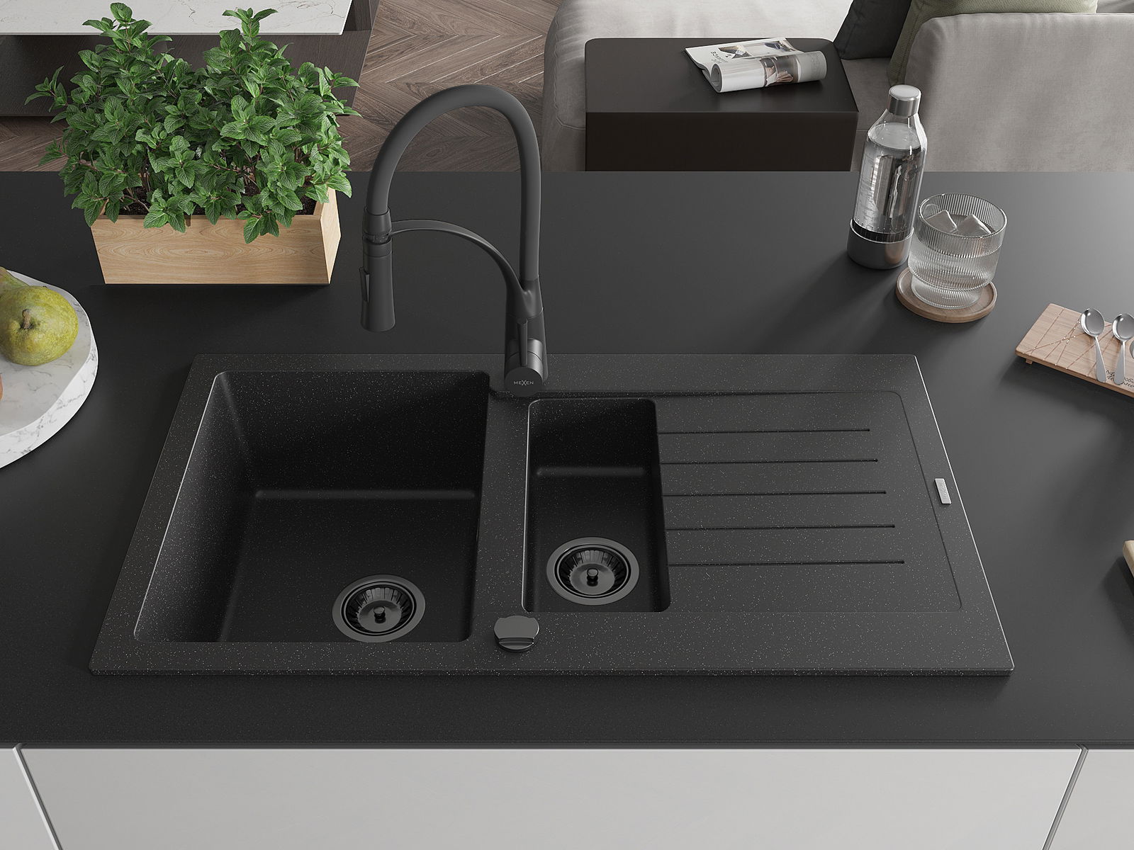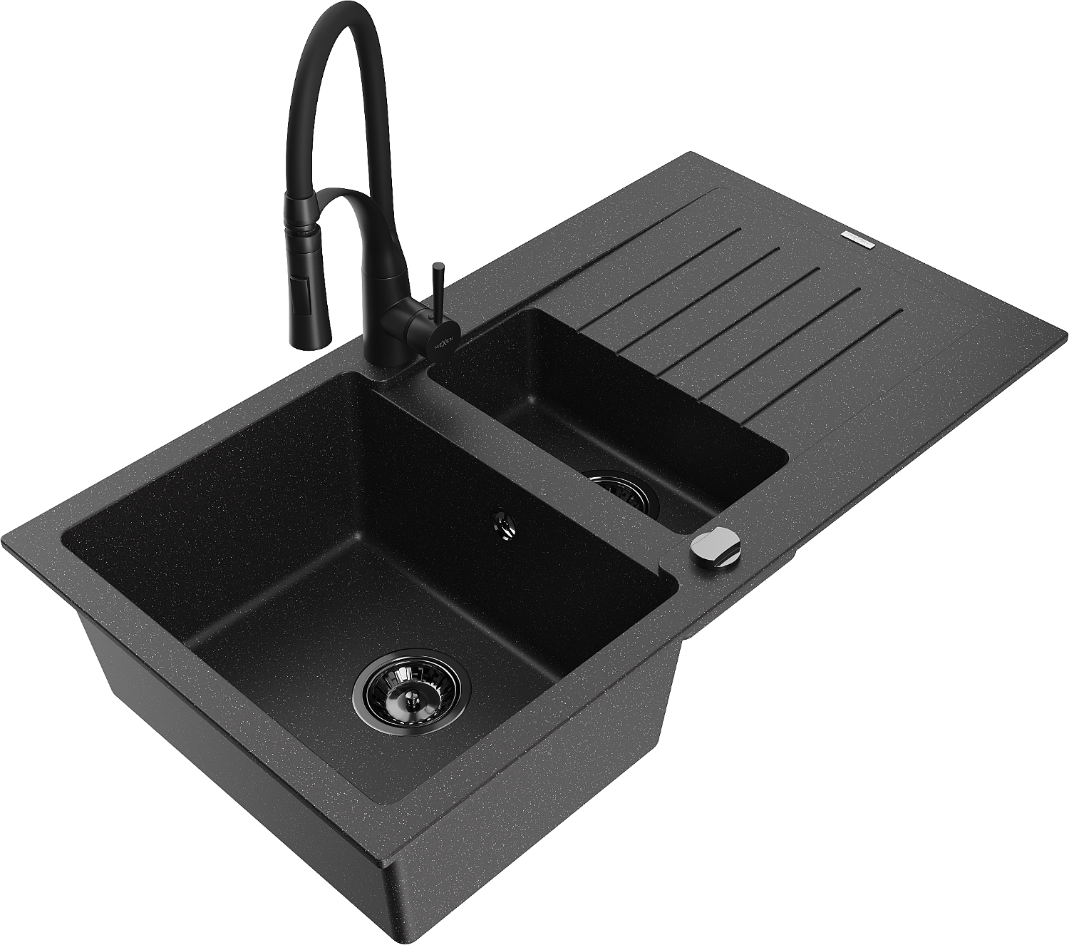 Mexen Matias granitový dřez 1,5-komorový s odkapávačem a kuchyňskou baterií Aster, černý/stříbrný - 6502-73-73450-70-B