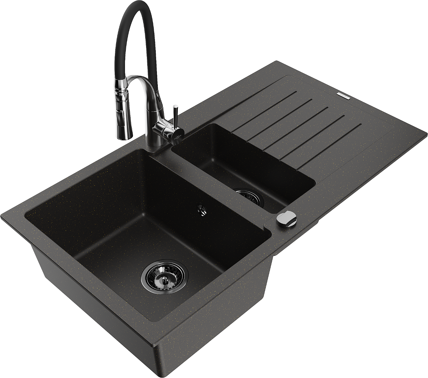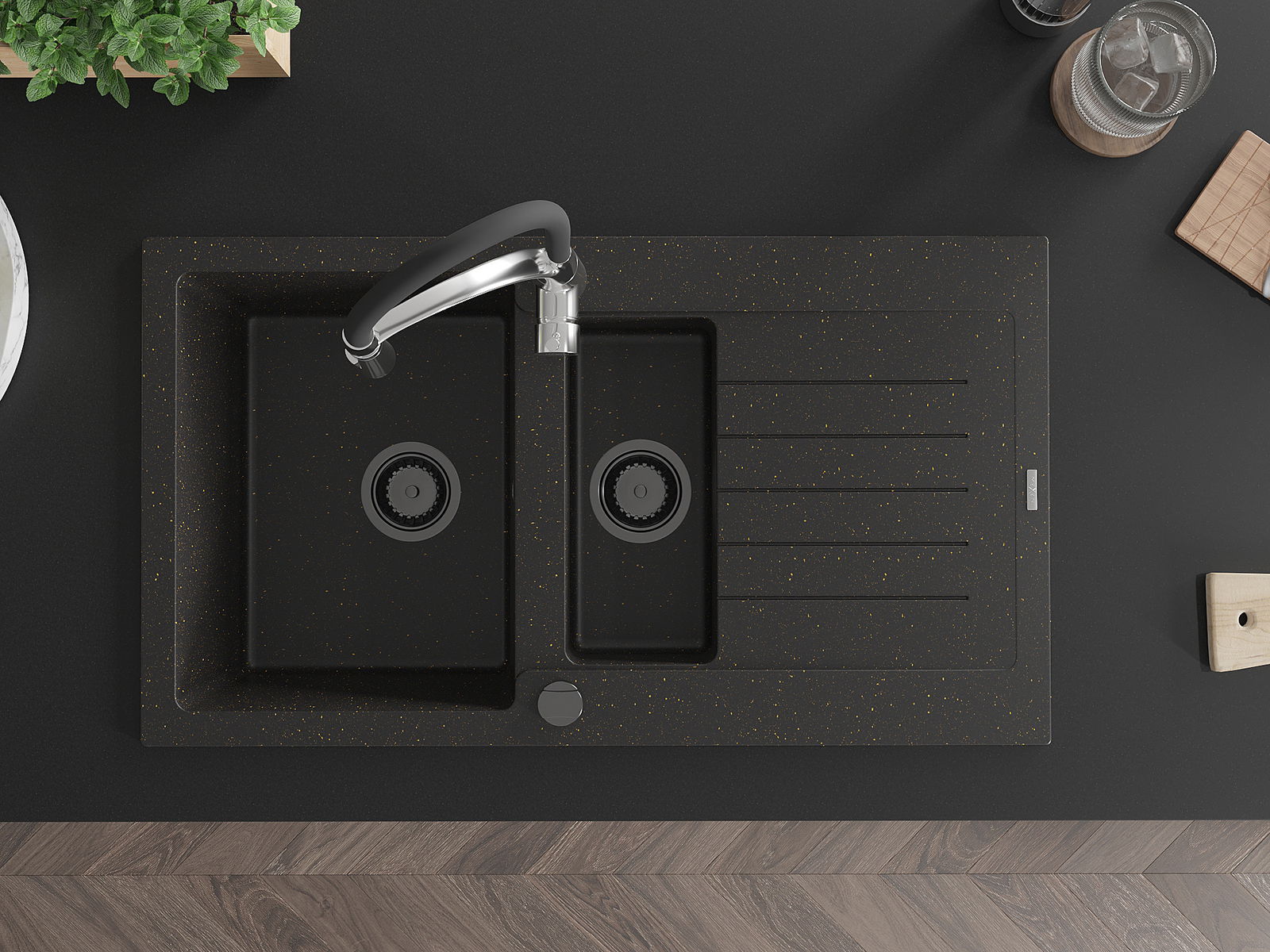 Mexen Matias granitový dřez 1,5-komorový s odkapávačem a kuchyňskou baterií Aster, černý/zlatý metalik - 6502-75-73450-07-B