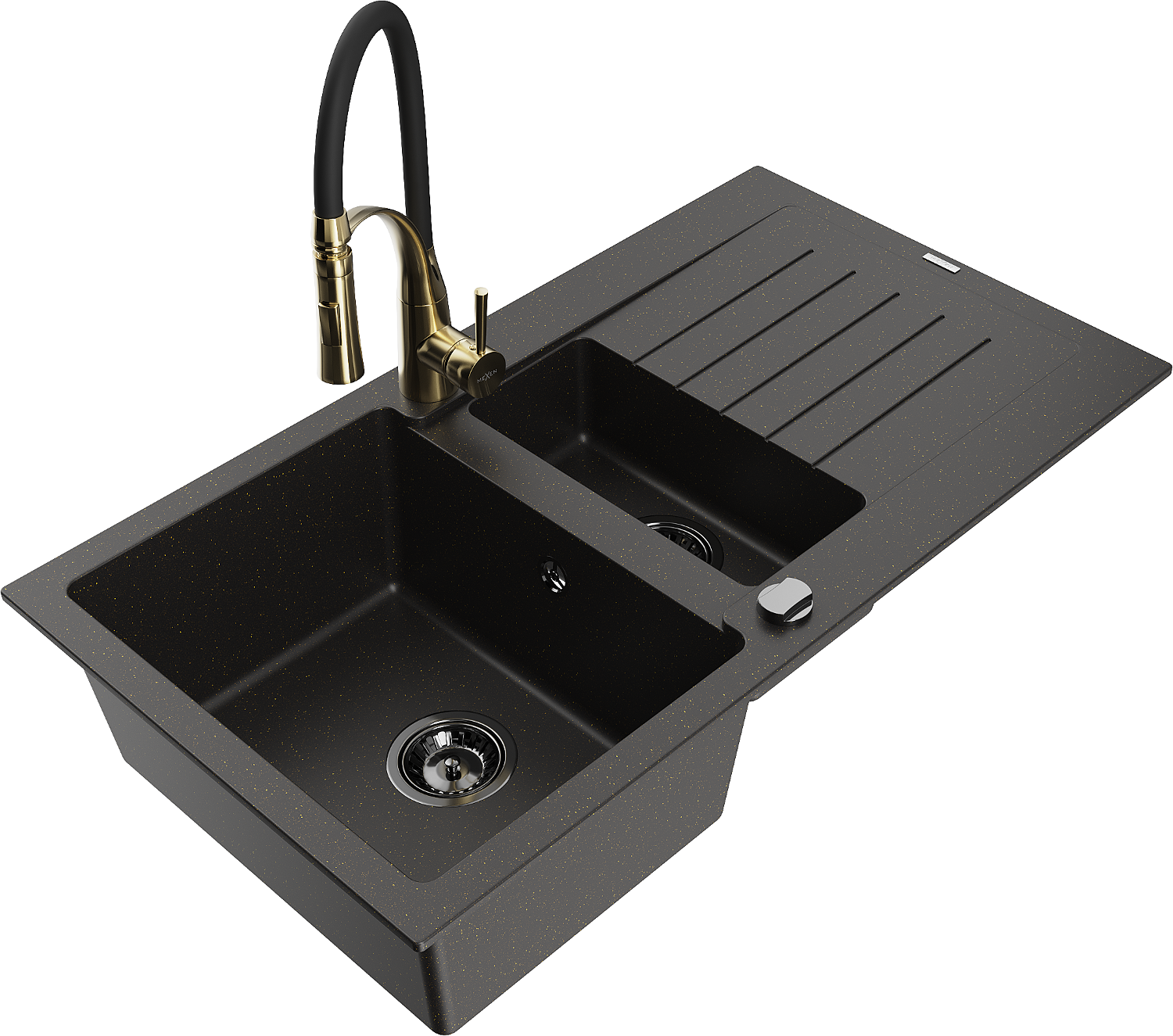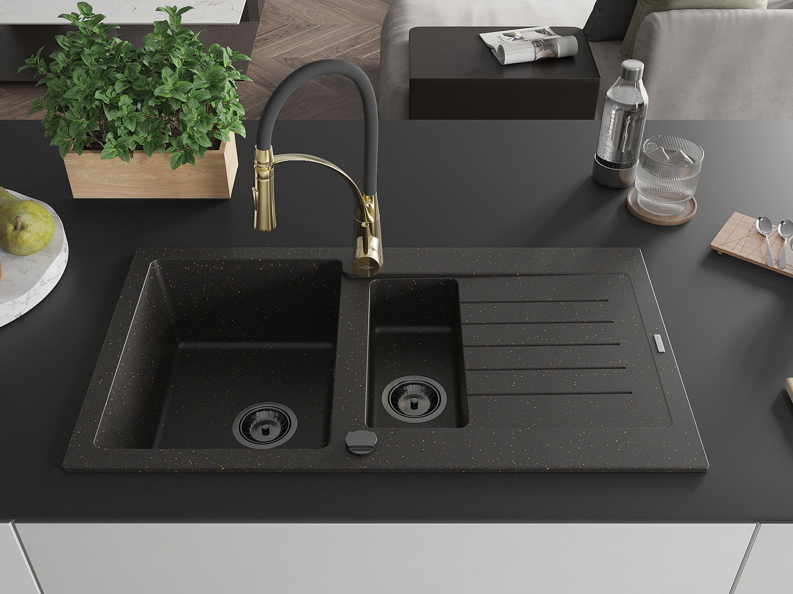 Mexen Matias granitový dřez 1,5 komorový s odkapávačem a kuchyňskou baterií Aster, černý/zlatý metalík - 6502-75-73450-57-B