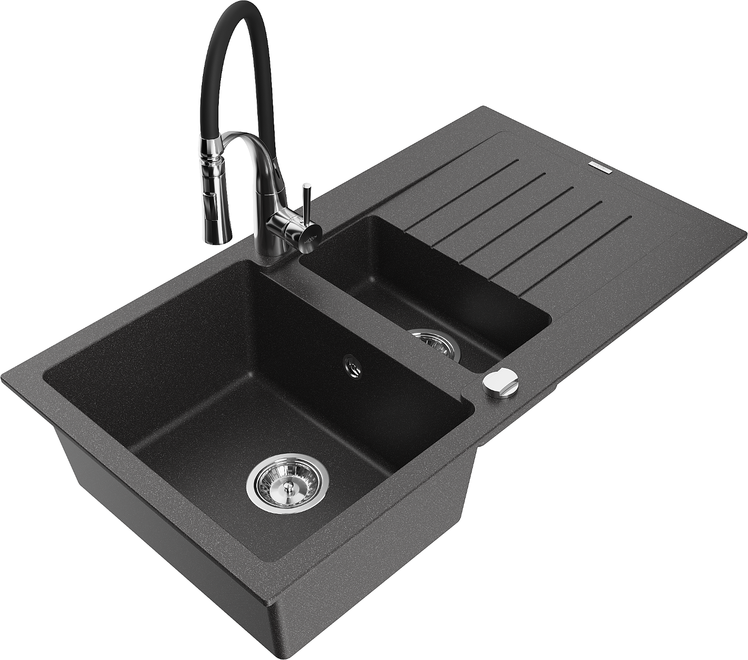 Mexen Matias granitový dřez 1,5-komorový s odkapávačem a kuchyňskou baterií Aster, černý skvrnitý - 6502-76-73450-07