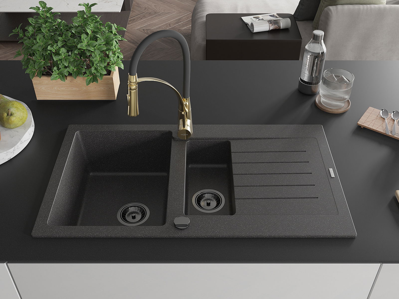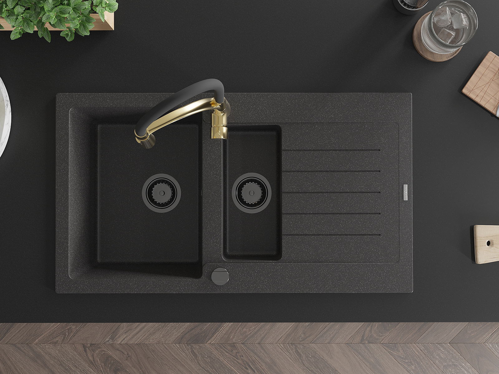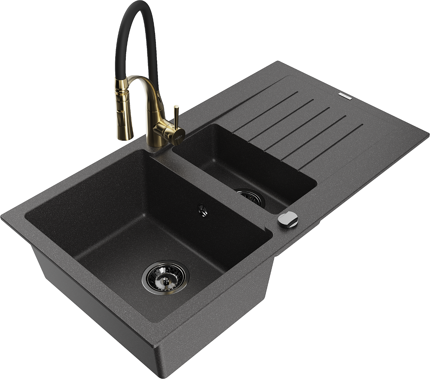 Mexen Matias granitový dřez 1,5-komorový s odkapávačem a kuchyňskou baterií Aster, černý s postříkaným - 6502-76-73450-57-B