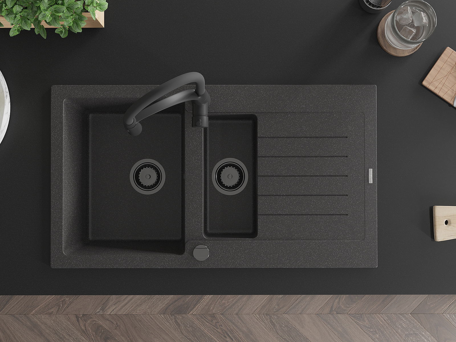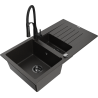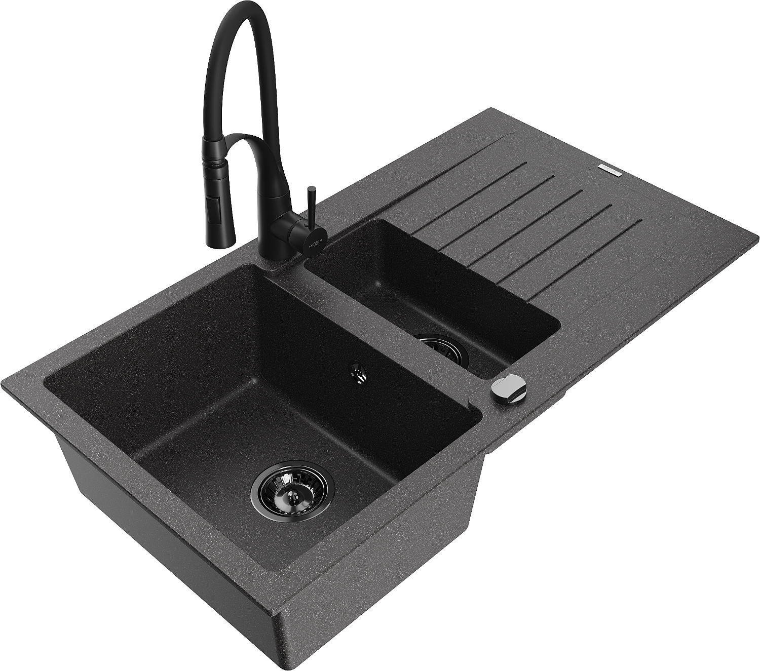 Mexen Matias granitový dřez 1,5-komorový s odkapávačem a kuchyňskou baterií Aster, černý kropenatý - 6502-76-73450-70-B