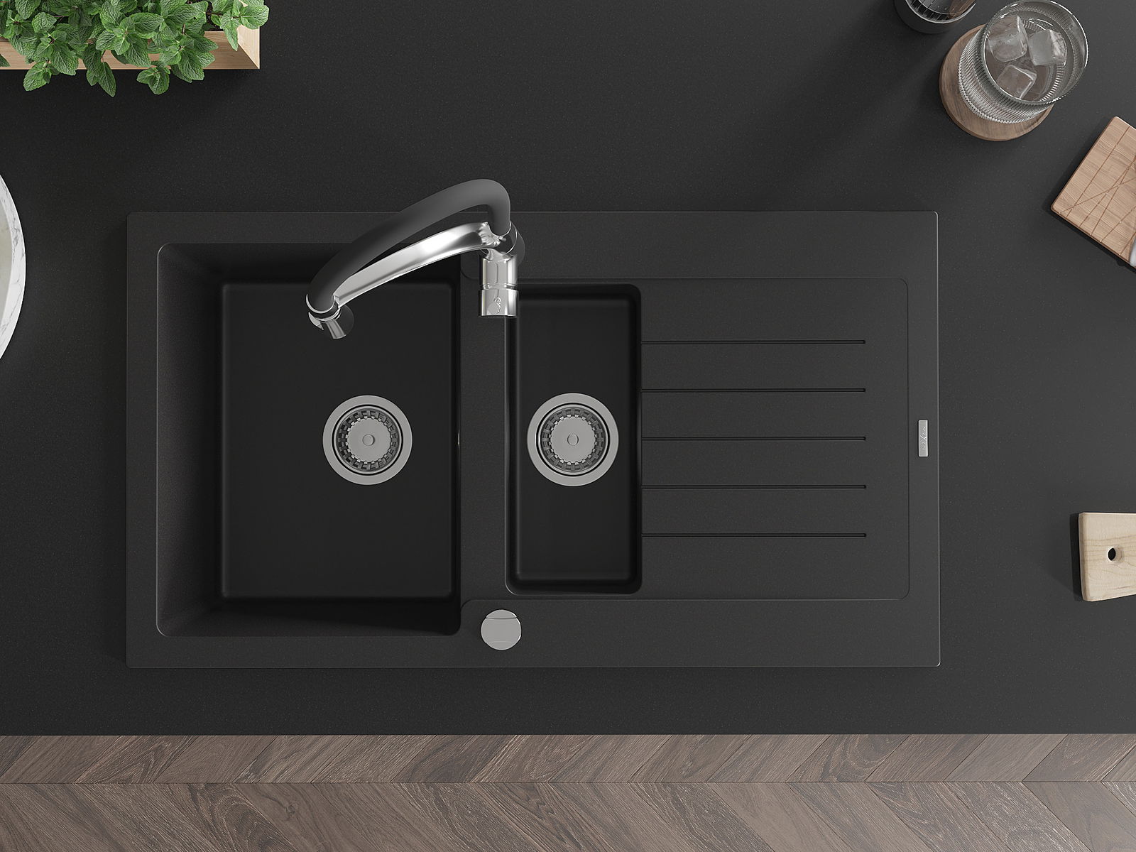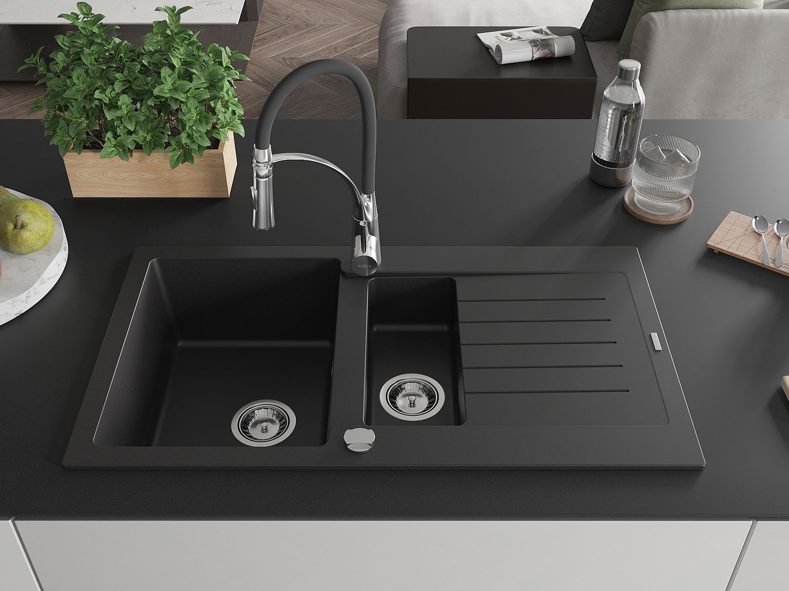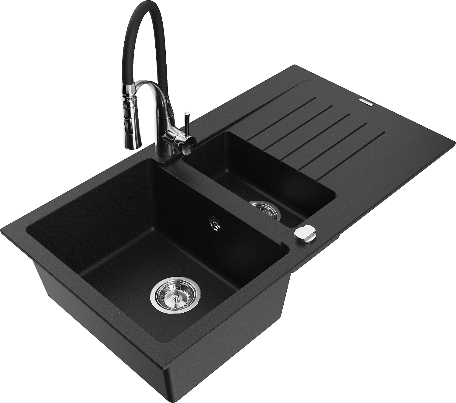 Mexen Matias dřez žulový 1,5-komorový s odkapávačem a kuchyňskou baterií Aster, černý - 6502-77-73450-07