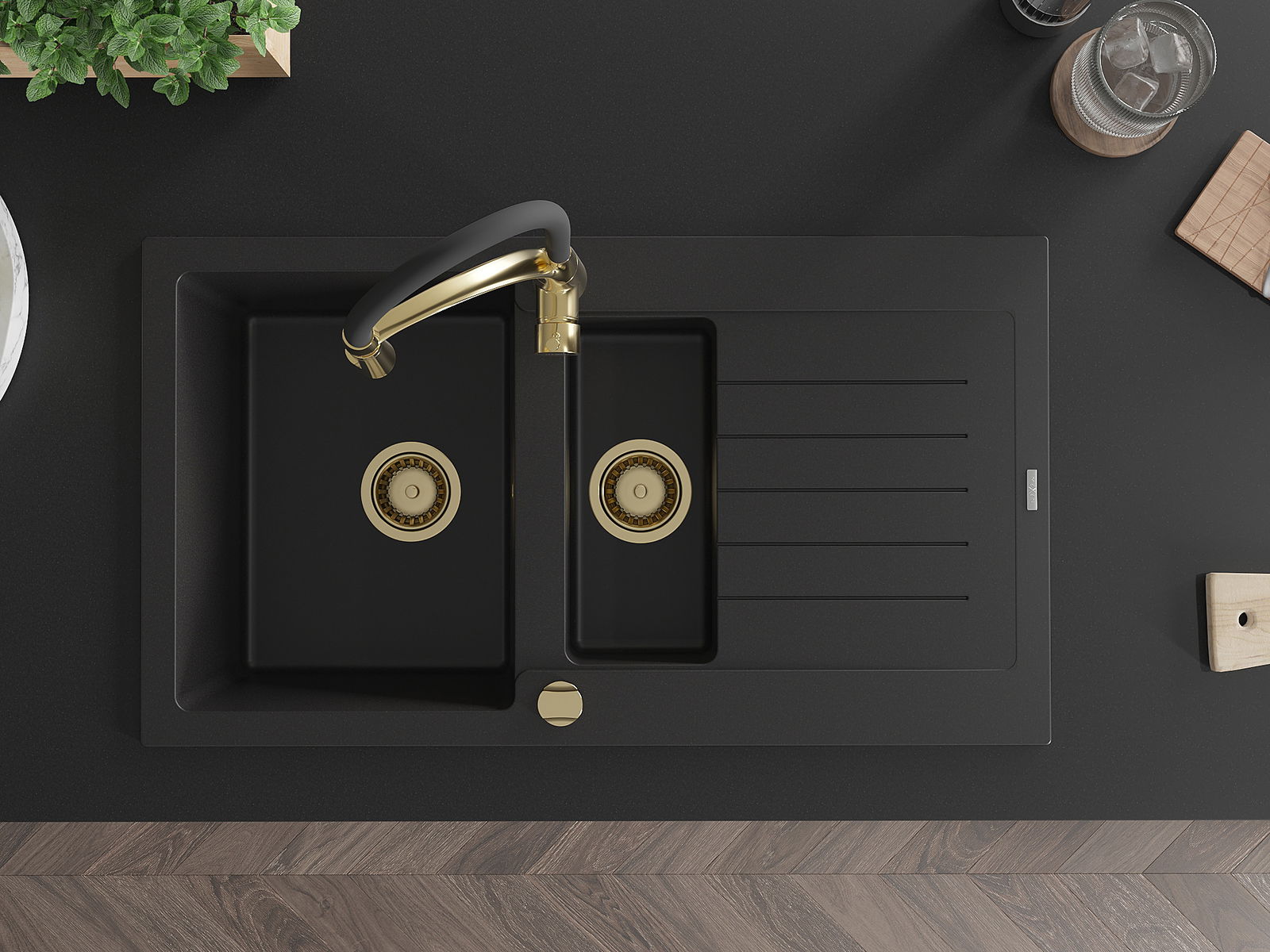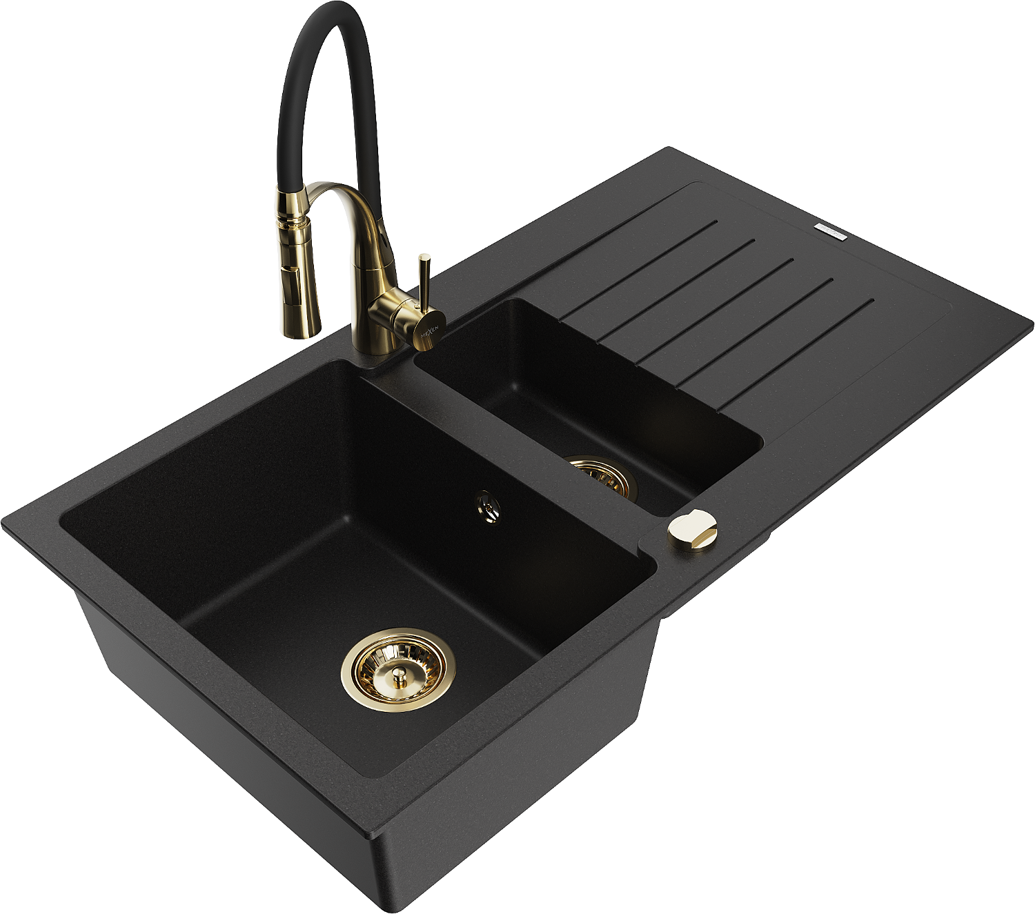 Mexen Matias granitový dřez 1,5-komorový s odkapávačem a kuchyňskou baterií Aster, černý - 6502-77-73450-57-G
