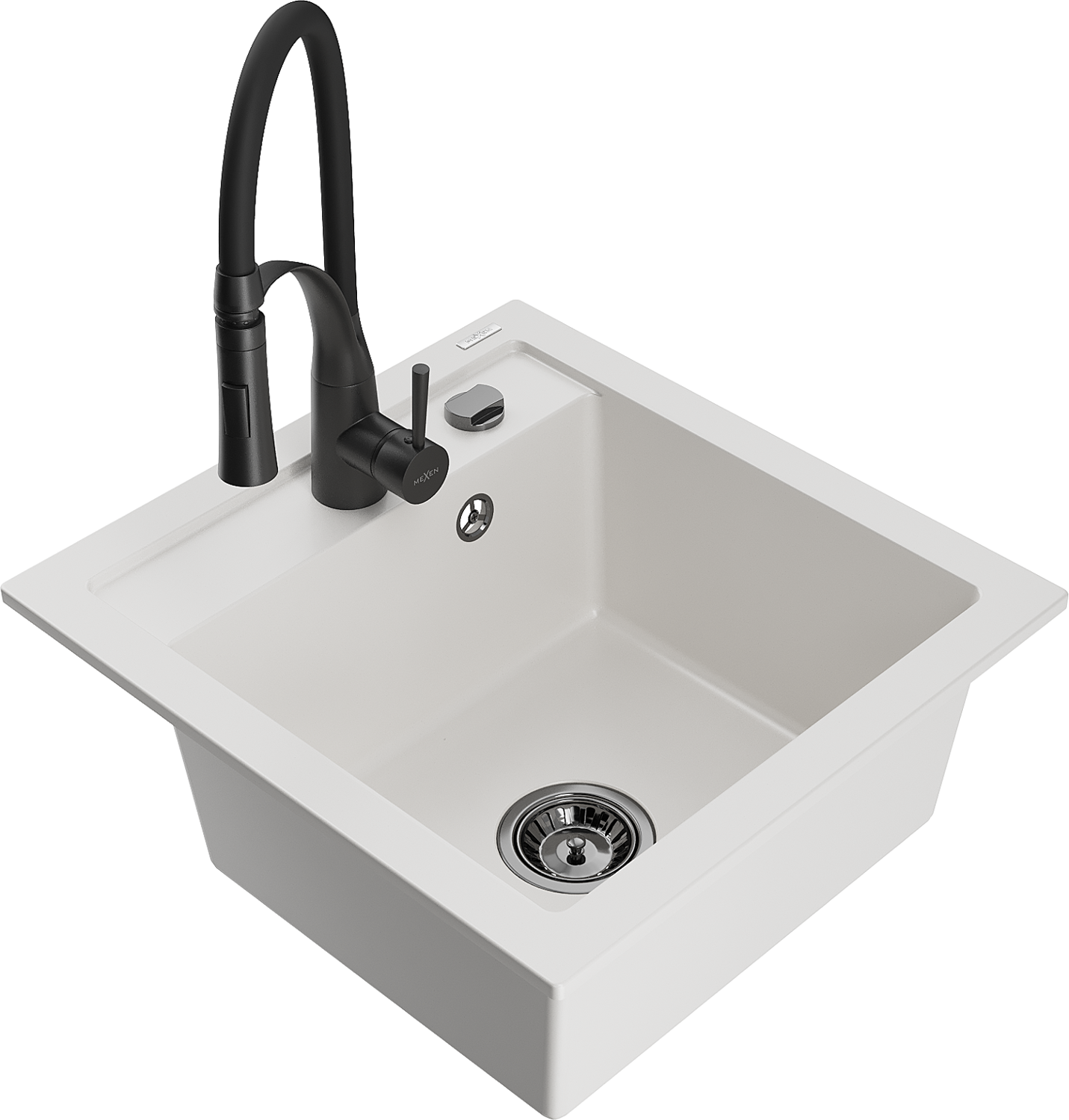 Mexen Vito granitový kuchyňský dřez 1-komorový s kuchyňskou baterií Aster, bílý - 6503-20-73450-70-B