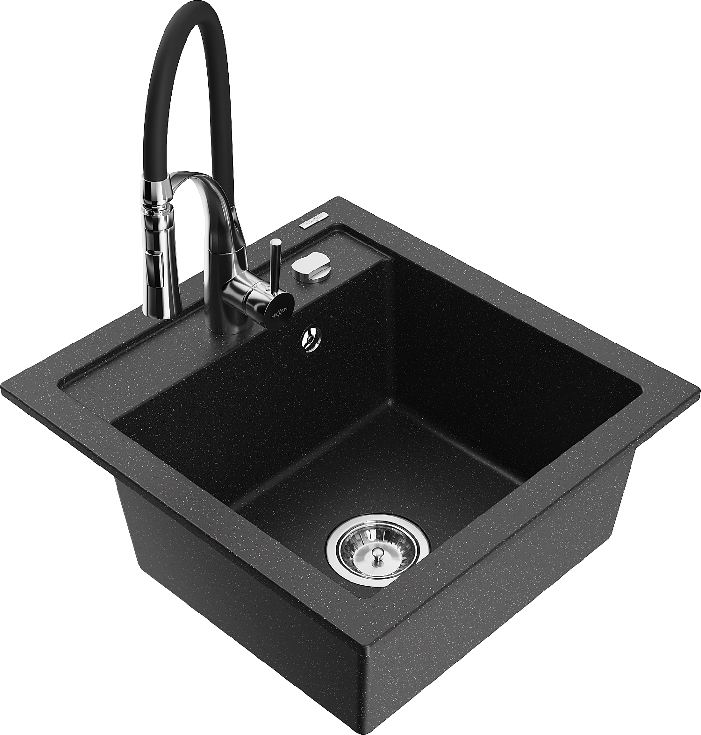 Mexen Vito granitový dřez 1-komorový s kuchyňskou baterií Aster, černý/stříbrný metalický- 6503-73-73450-07