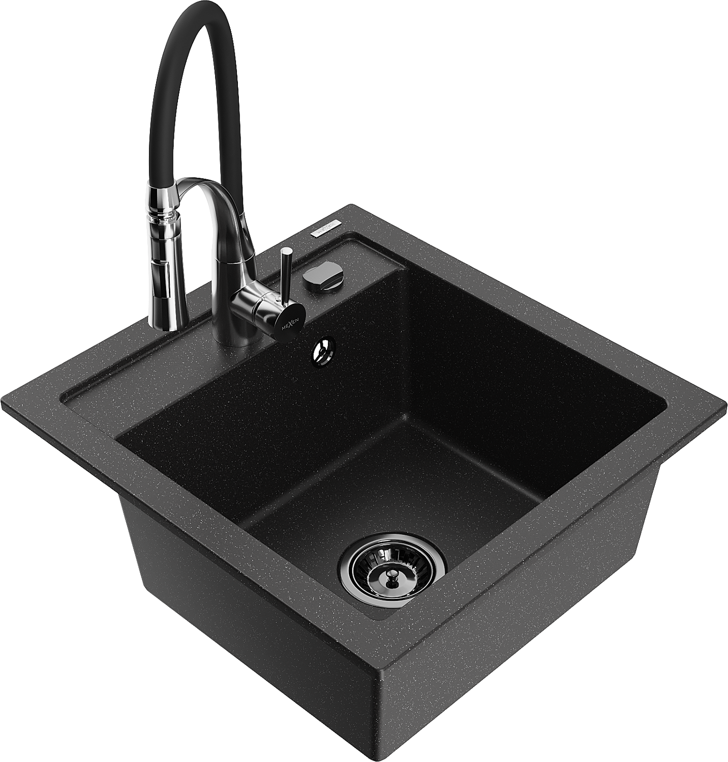 Mexen Vito granitový dřez 1-komorový s kuchyňskou baterií Aster, černý/stříbrný metalický- 6503-73-73450-07-B