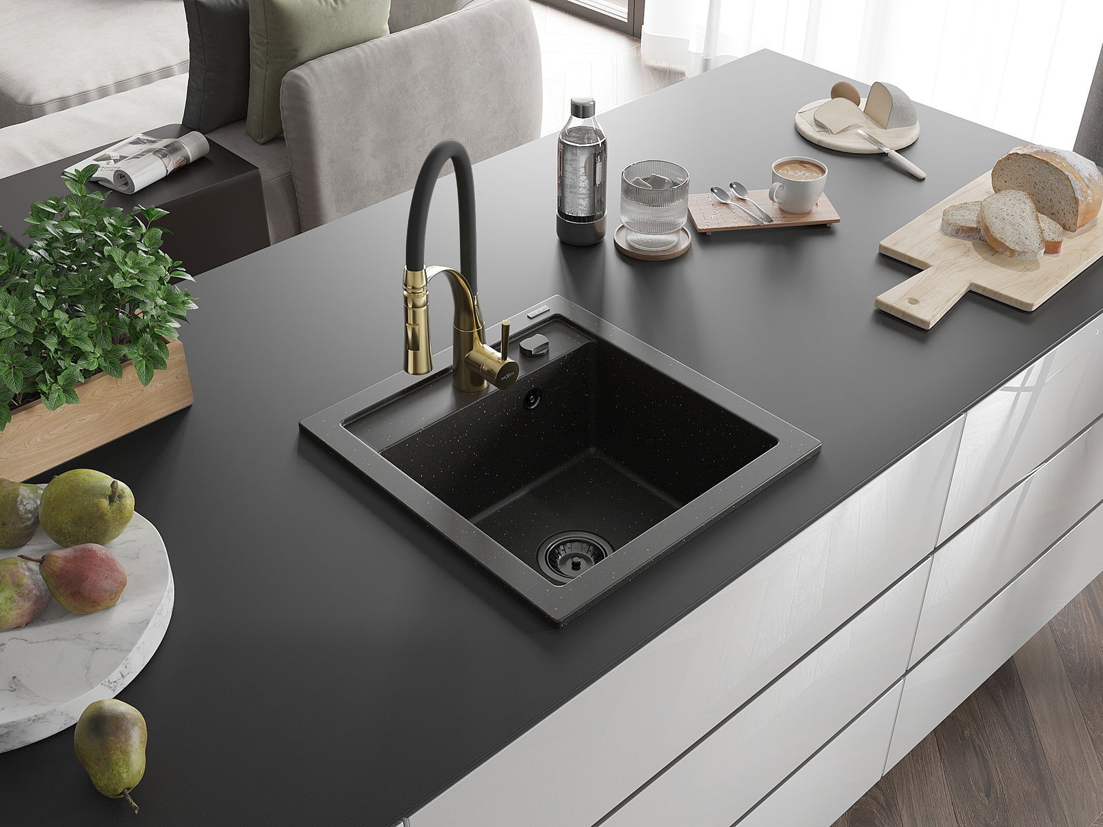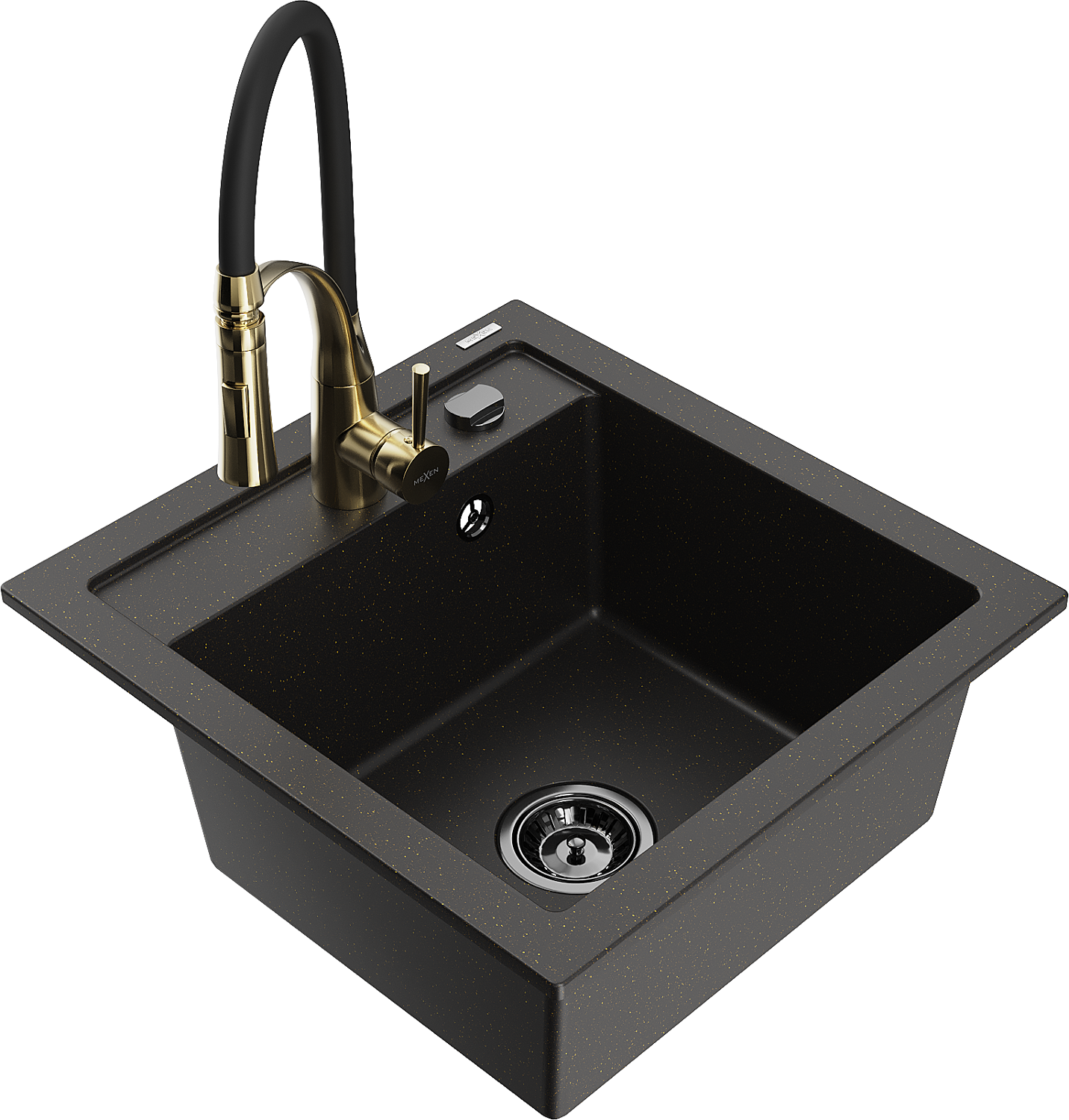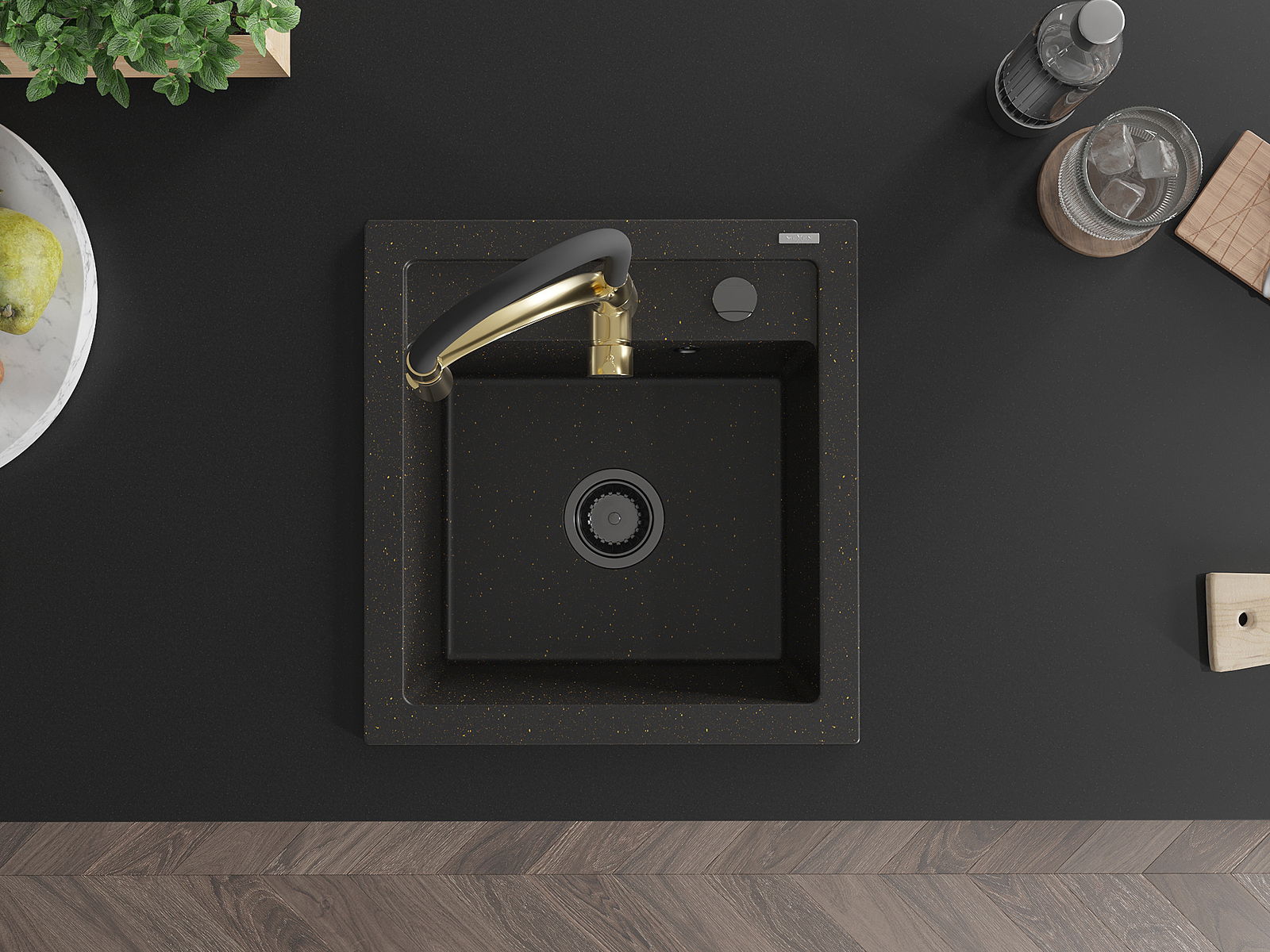 Mexen Vito granitový dřez 1-komorový s kuchyňskou baterií Aster, černý/zlatý metalik- 6503-75-73450-57-B