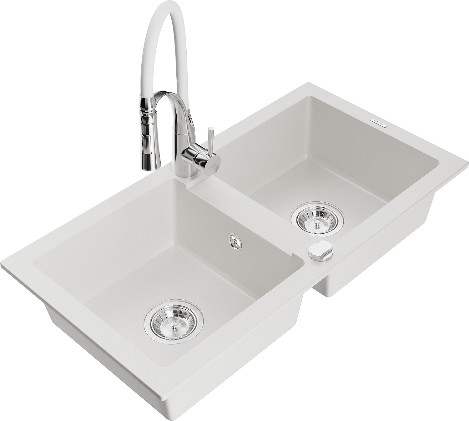 Mexen Mario žulový dvoukomorový dřez s kuchyňskou baterií Aster, bílý - 6504-20-73450-02