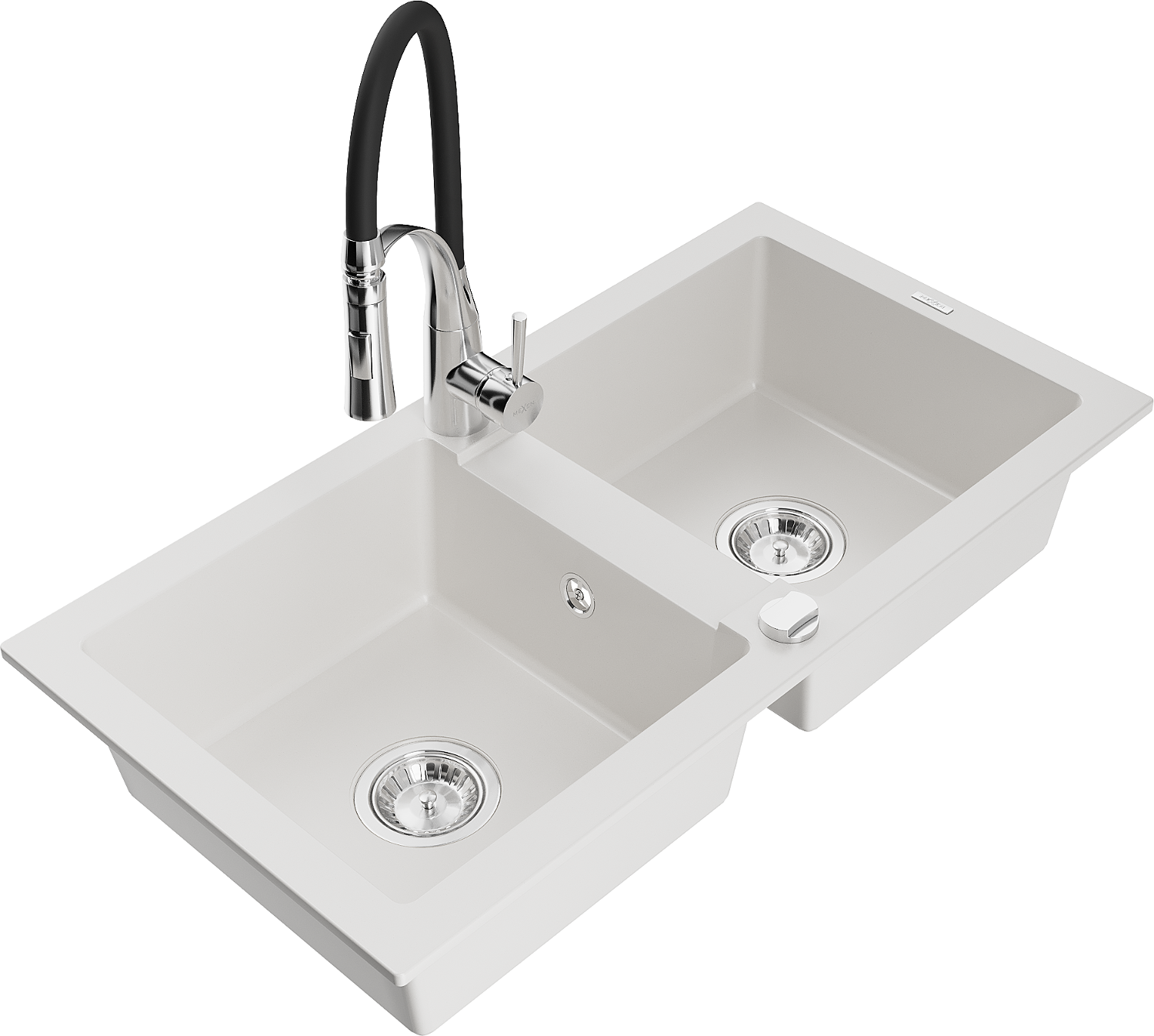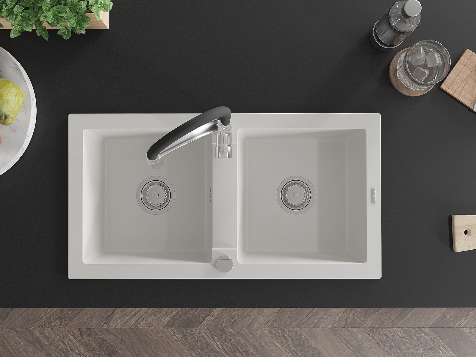 Mexen Mario žulový dřez s 2 komorami s kuchyňskou baterií Aster, bílý - 6504-20-73450-07
