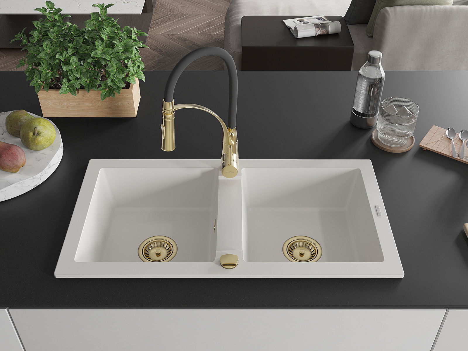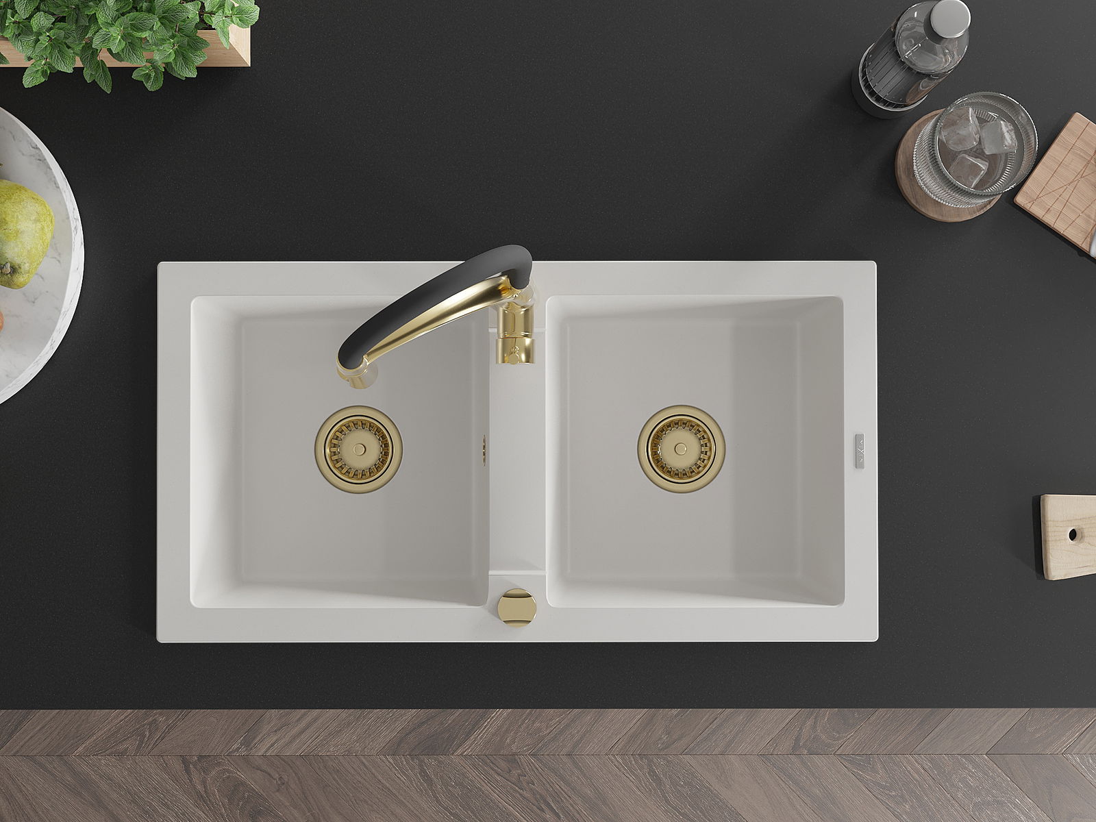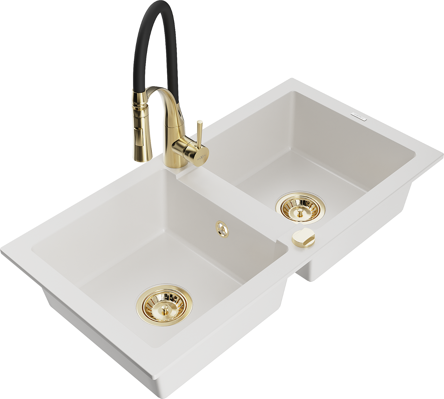 Mexen Mario žulový dřez 2-komorový s kuchyňskou baterií Aster, bílý - 6504-20-73450-57-G