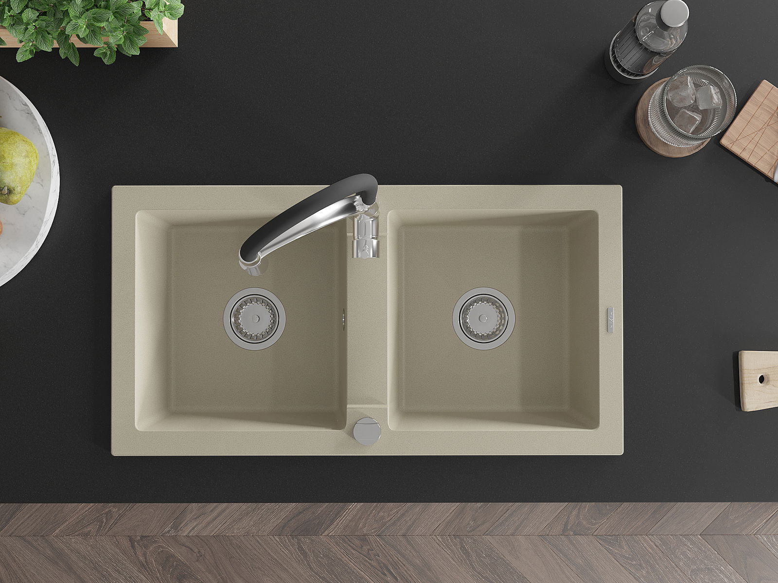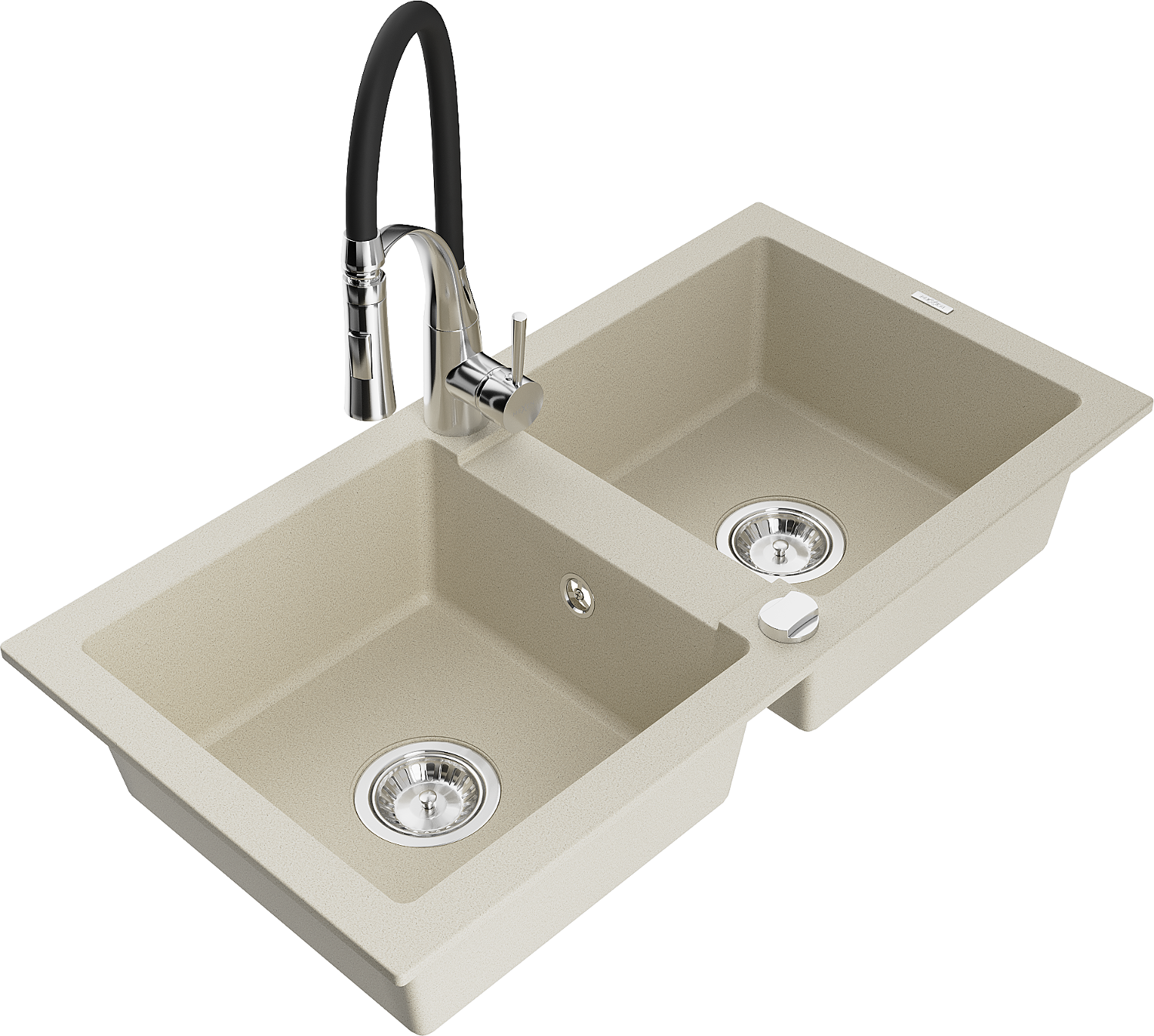 Mexen Mario dřez granitový 2-komorový s kuchyňskou baterií Aster, béžový - 6504-69-73450-07