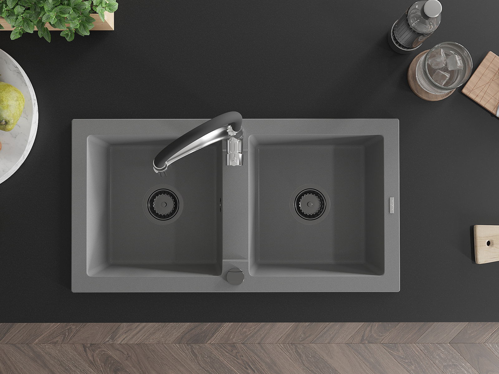 Mexen Mario dřez granitový 2-komorový s kuchyňskou baterií Aster, šedý - 6504-71-73450-07-B