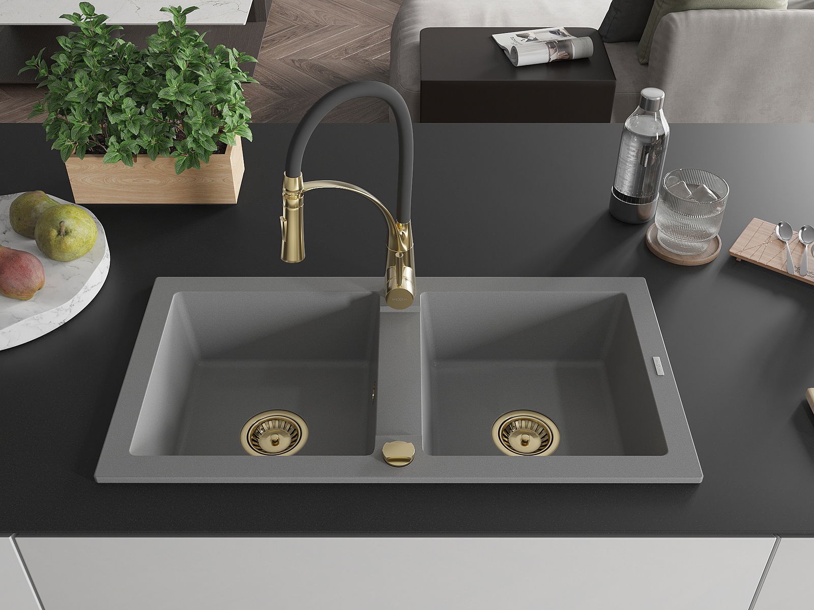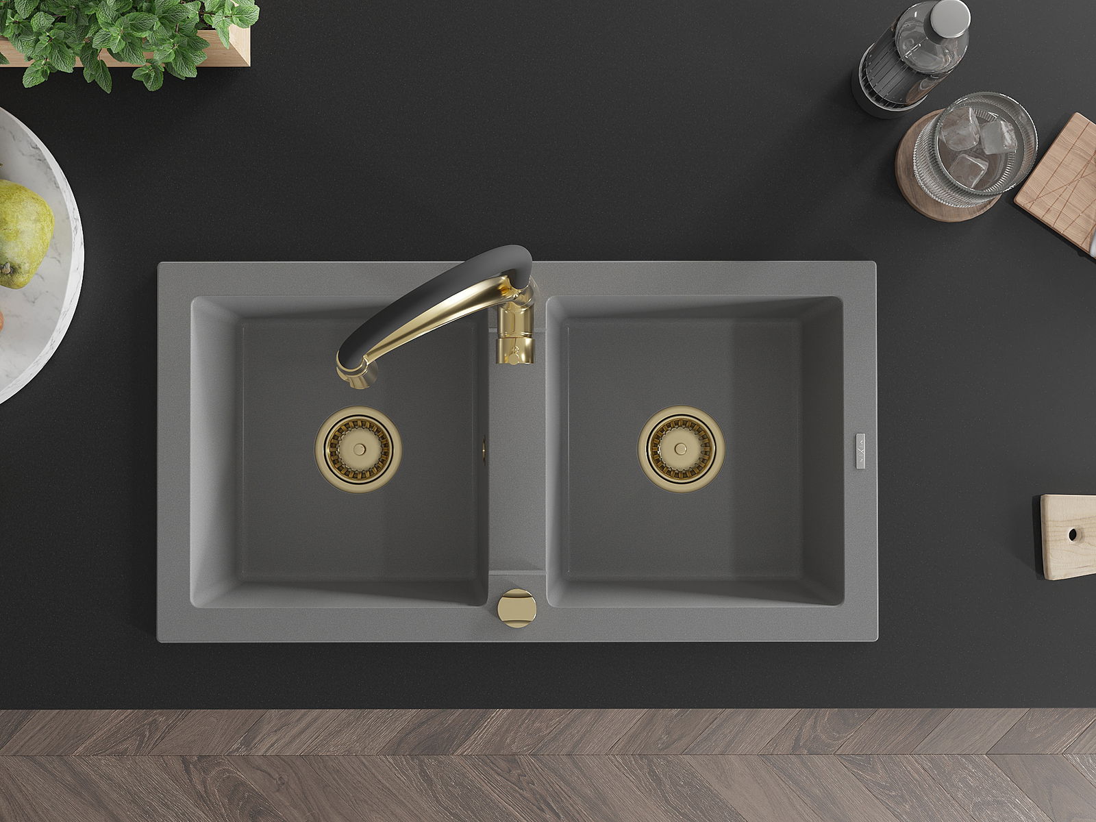 Mexen Mario granitový dřez 2-komorový s kuchyňskou baterií Aster, šedý - 6504-71-73450-57-G