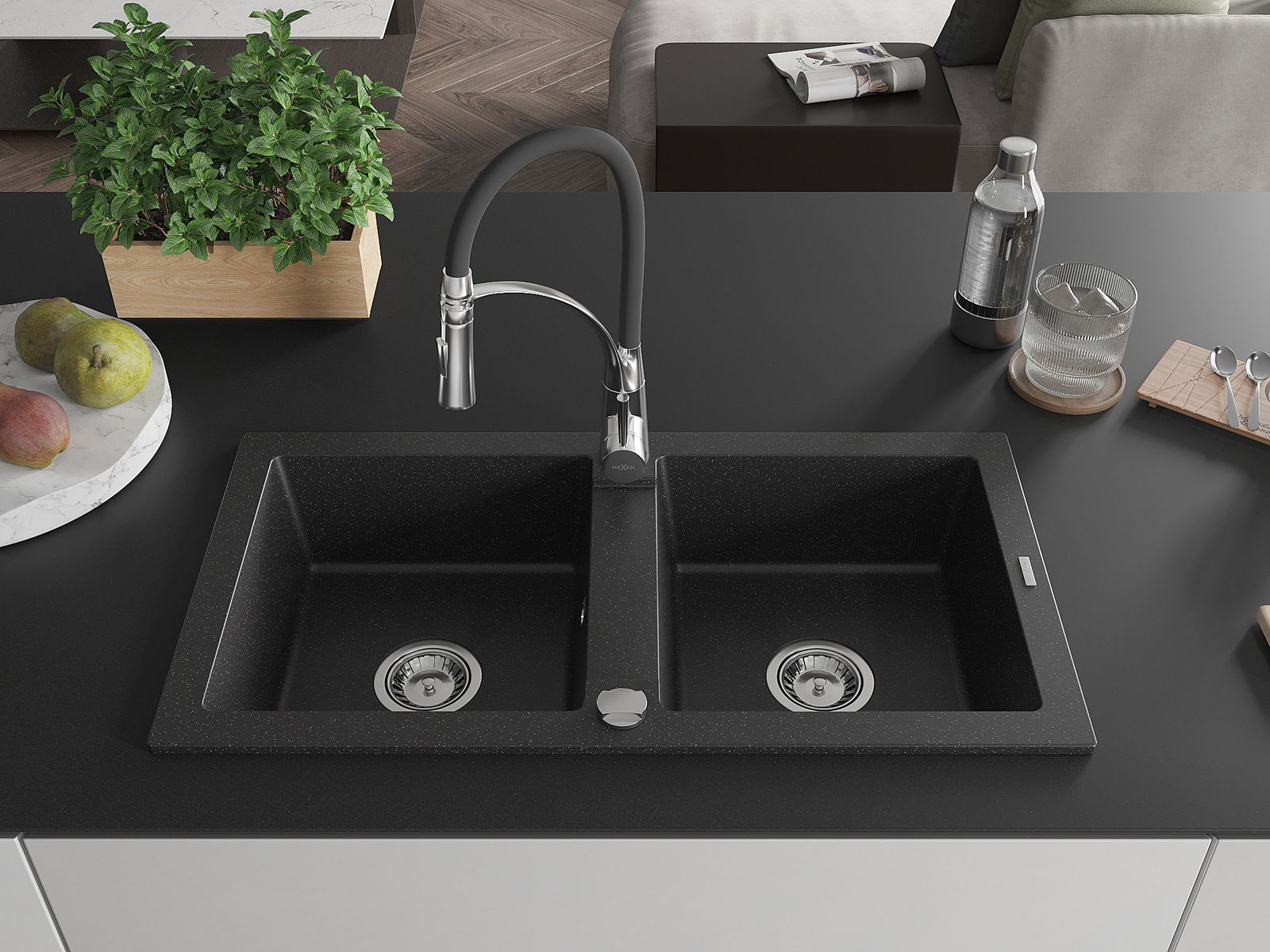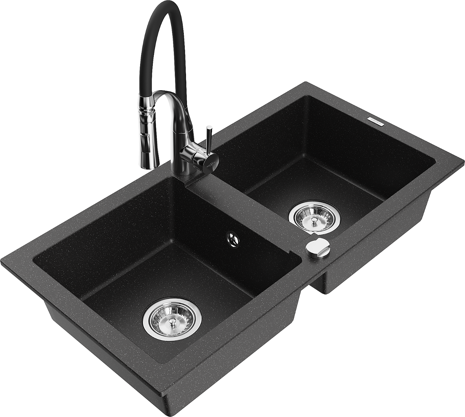 Mexen Mario granitový dřez dvoukomorový s kuchyňskou baterií Aster, černý/stříbrný metalik - 6504-73-73450-07