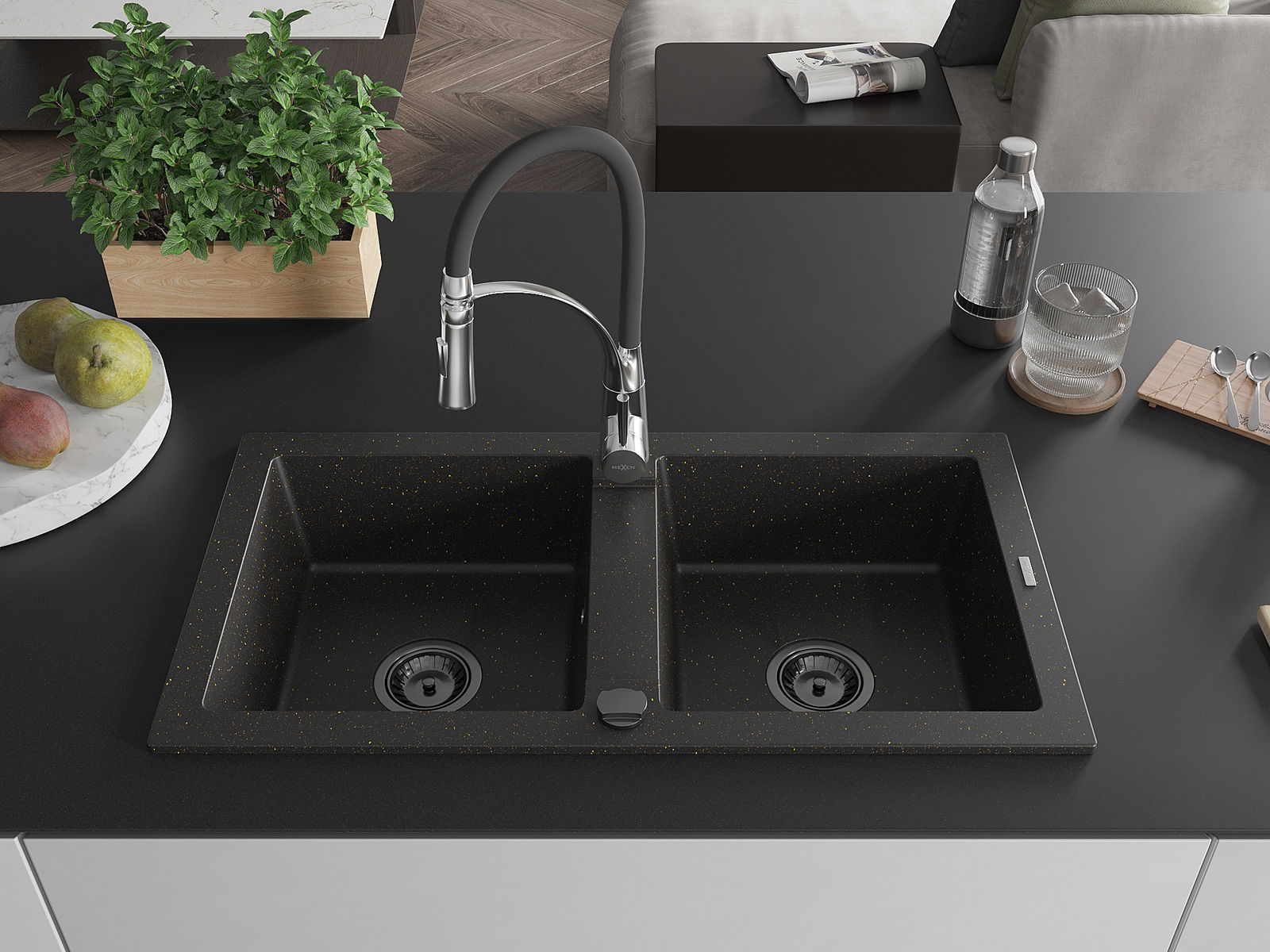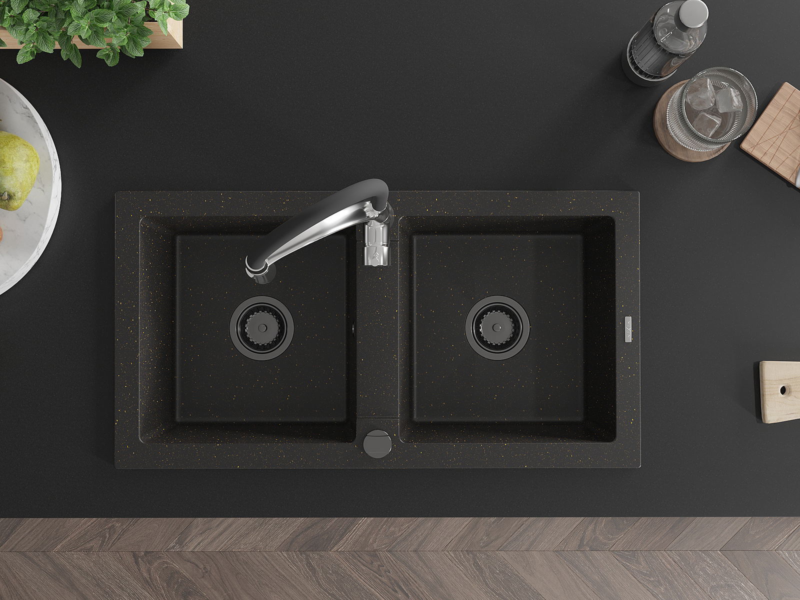 Mexen Mario granitový dvojitý dřez s kuchyňskou baterií Aster, černý/zlatý metalický - 6504-75-73450-07-B