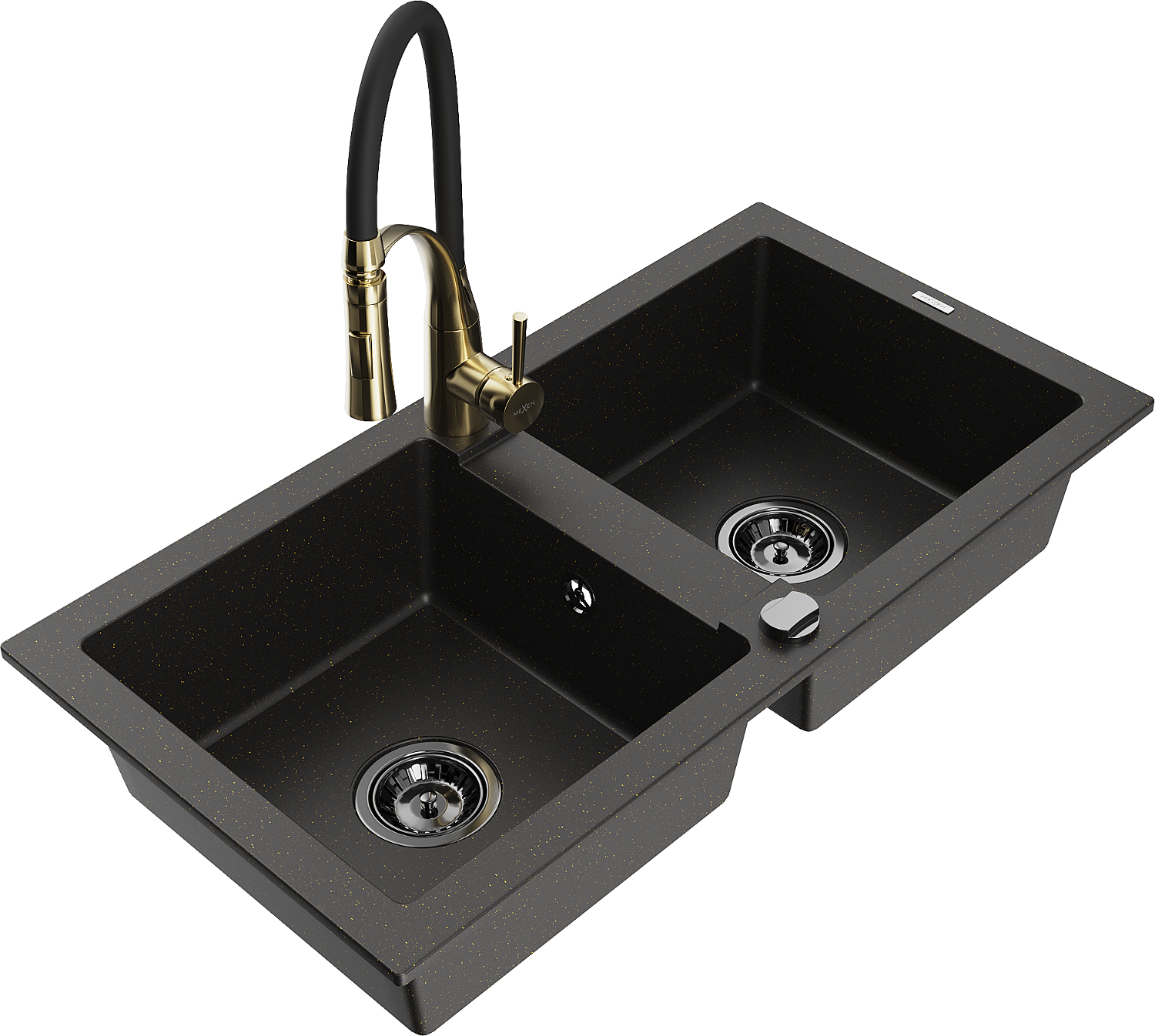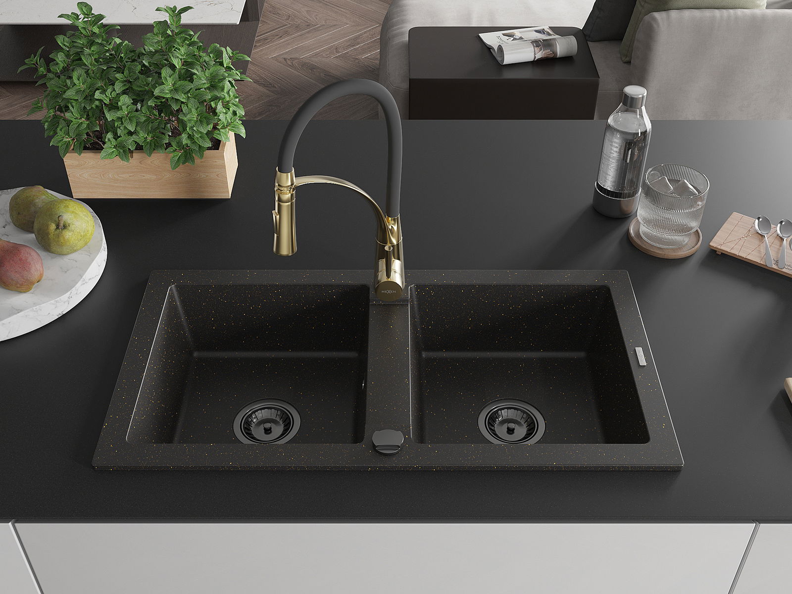 Mexen Mario dřez granitový 2-komorový s kuchyňskou baterií Aster, černý/zlatý metalik - 6504-75-73450-57-B