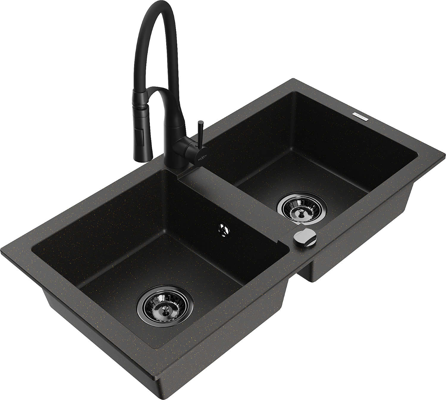 Mexen Mario granitový dřez 2-komorový s kuchyňskou baterií Aster, černý/zlatý metalik - 6504-75-73450-70-B