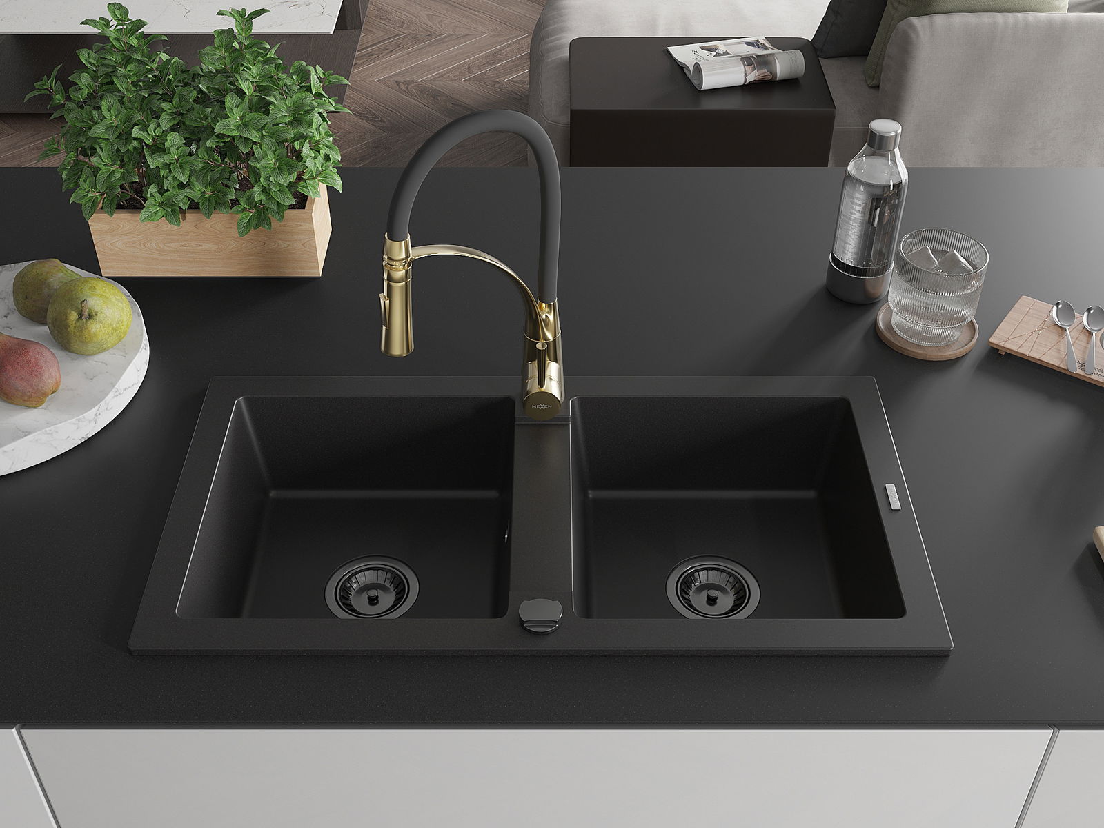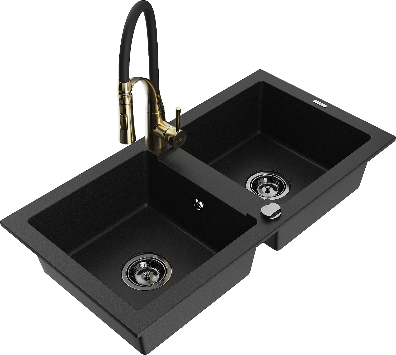 Mexen Mario dvoukomorový granitový dřez s kuchyňskou baterií Aster, černý - 6504-77-73450-57-B