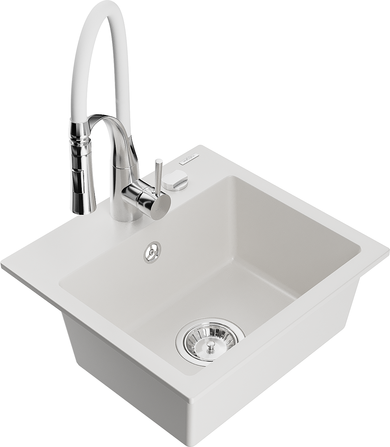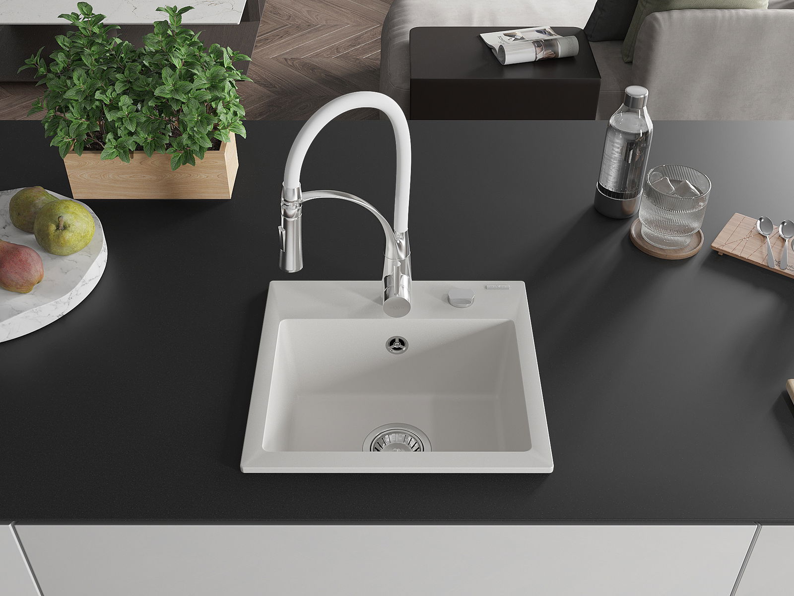 Mexen Milo granitový dřez s 1 komorou a kuchyňskou baterií Aster, bílý - 6505-20-73450-02