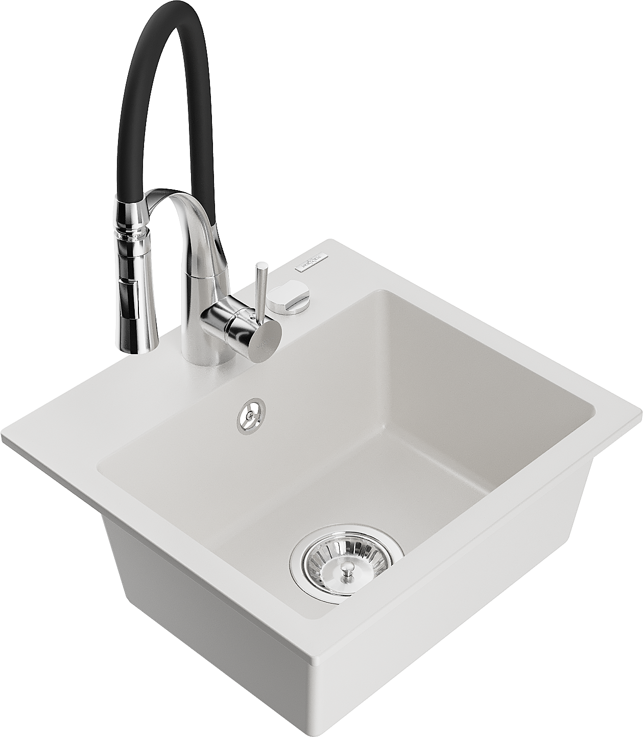 Mexen Milo granitový dřez 1-komorový s kuchyňskou baterií Aster, bílý - 6505-20-73450-07