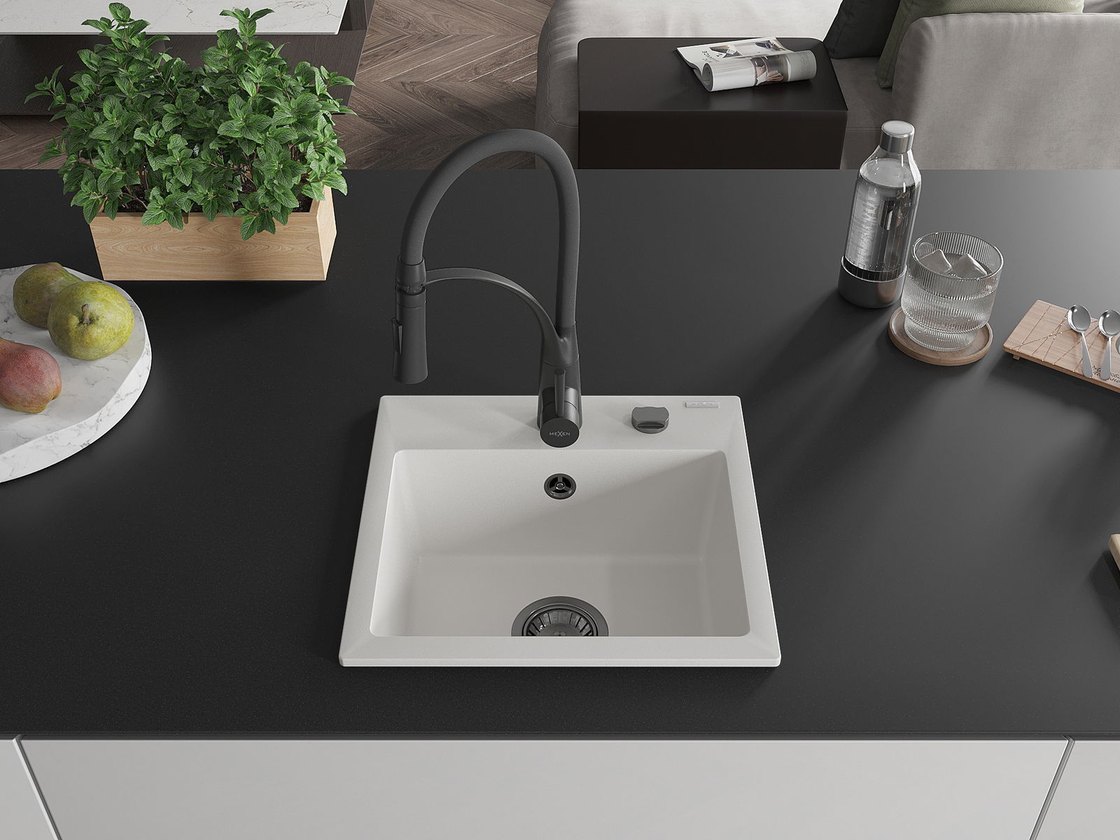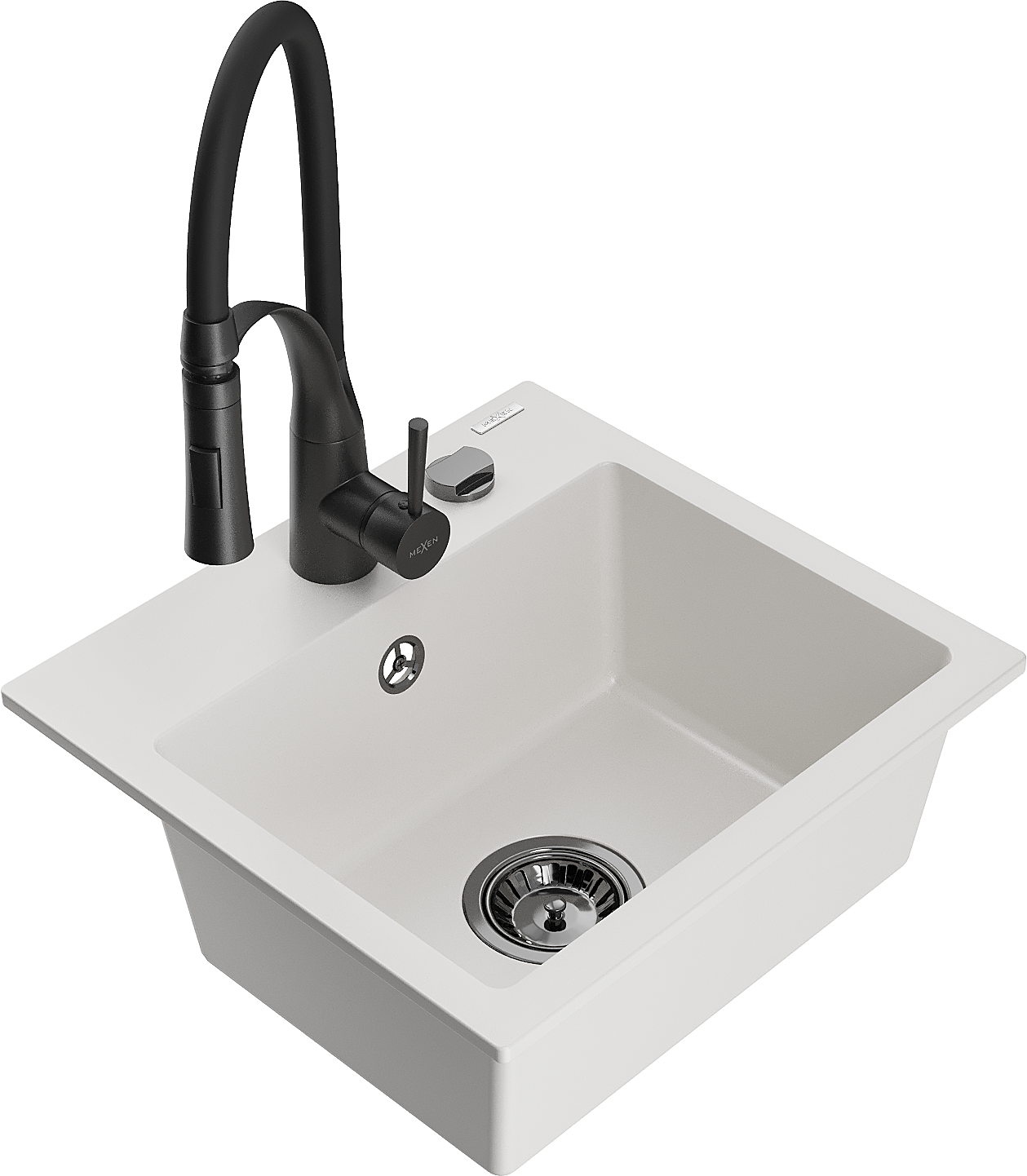 Mexen Milo granitový dřez 1-komorový s kuchyňskou baterií Aster, bílý - 6505-20-73450-70-B