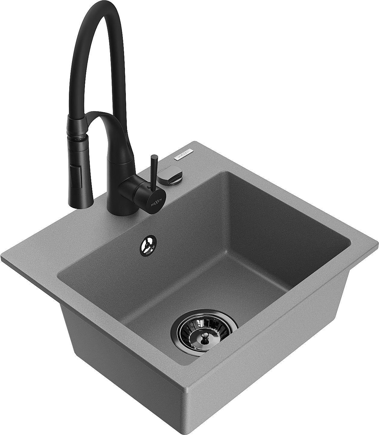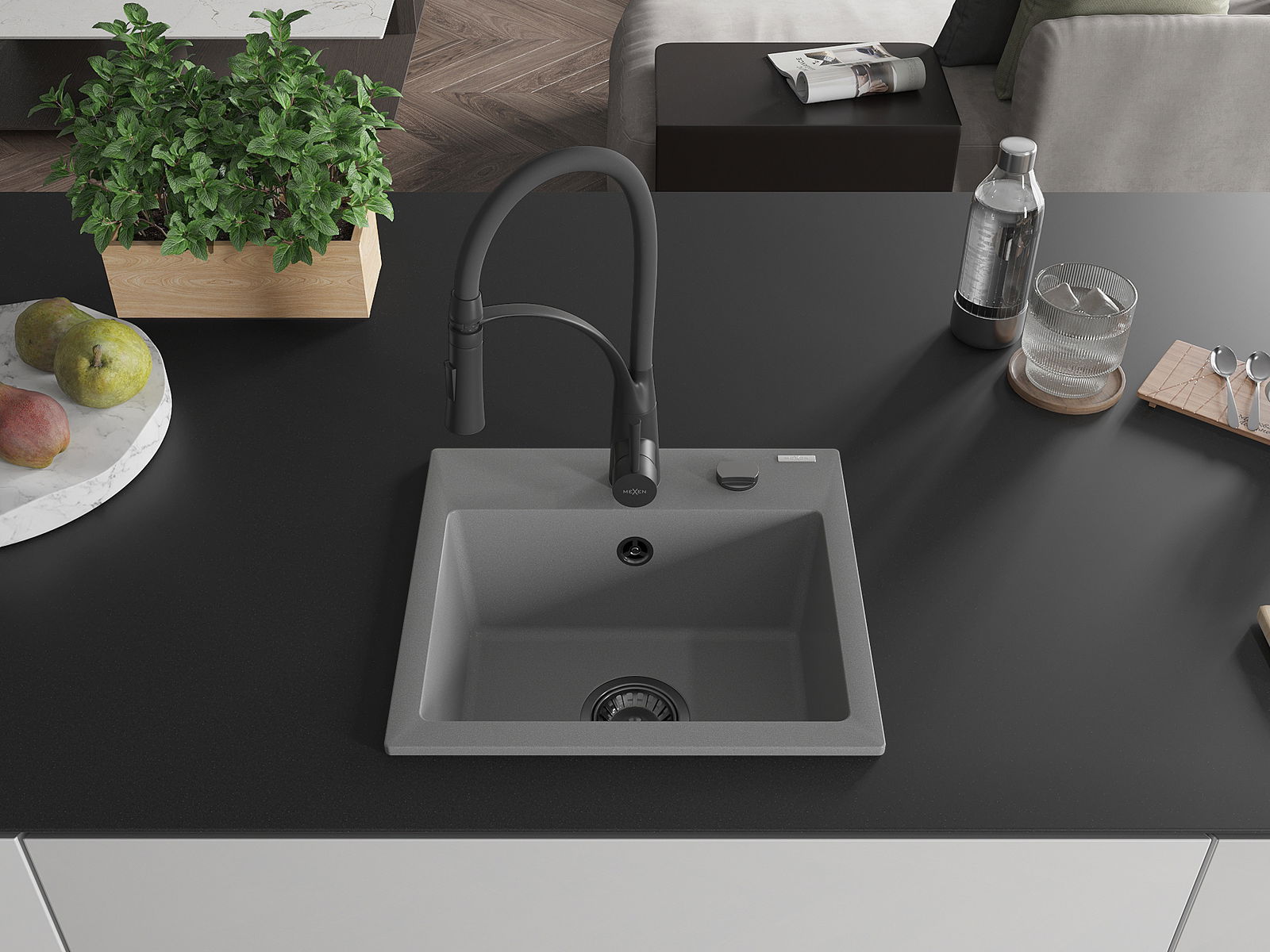 Mexen Milo granitový dřez 1-komorový s kuchyňskou baterií Aster, šedý - 6505-71-73450-70-B